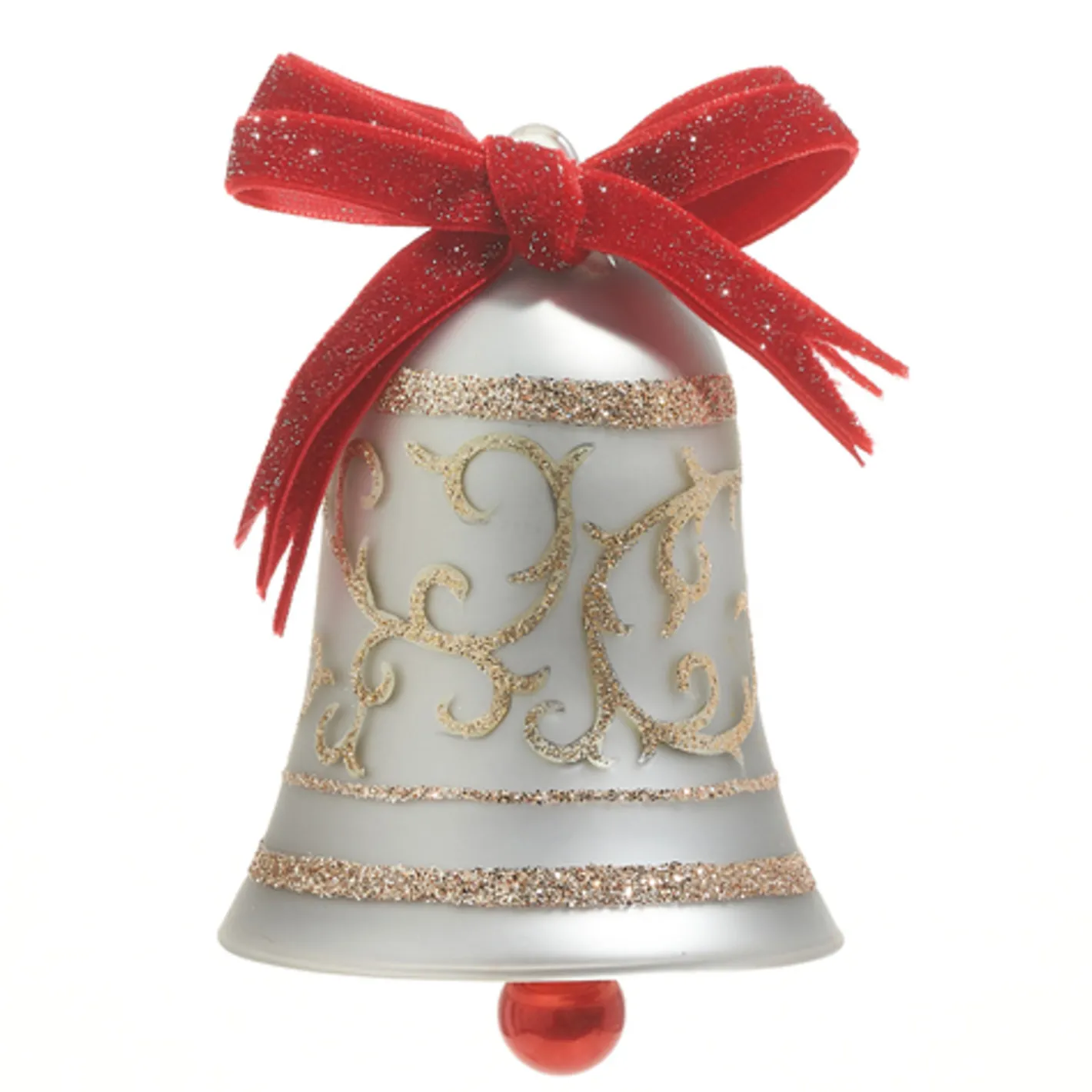 Add this stunning little bell to your Christmas tree this year! It features a silver bell and gold glitter and a red velvet bow! Made by Raz Imports. Made of glass. Dimensions: 4″ L X 2.75″ W X 4″ H.