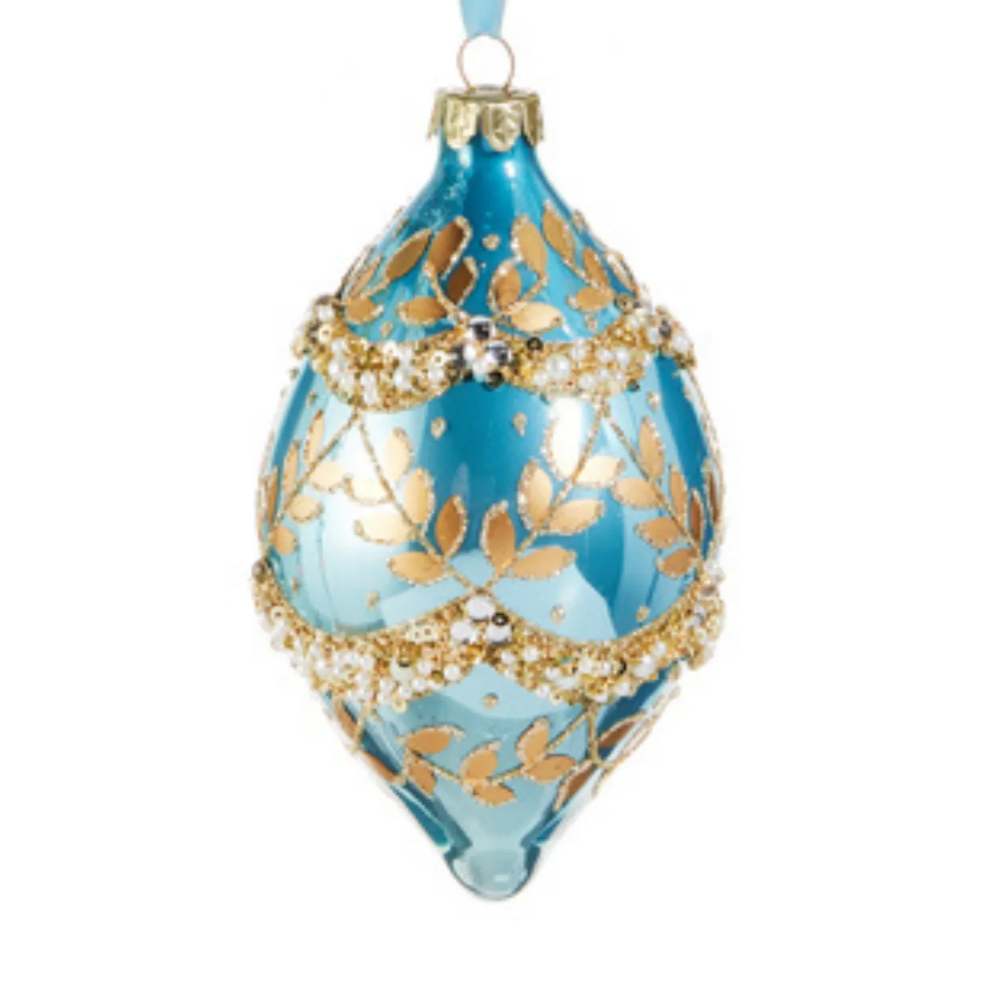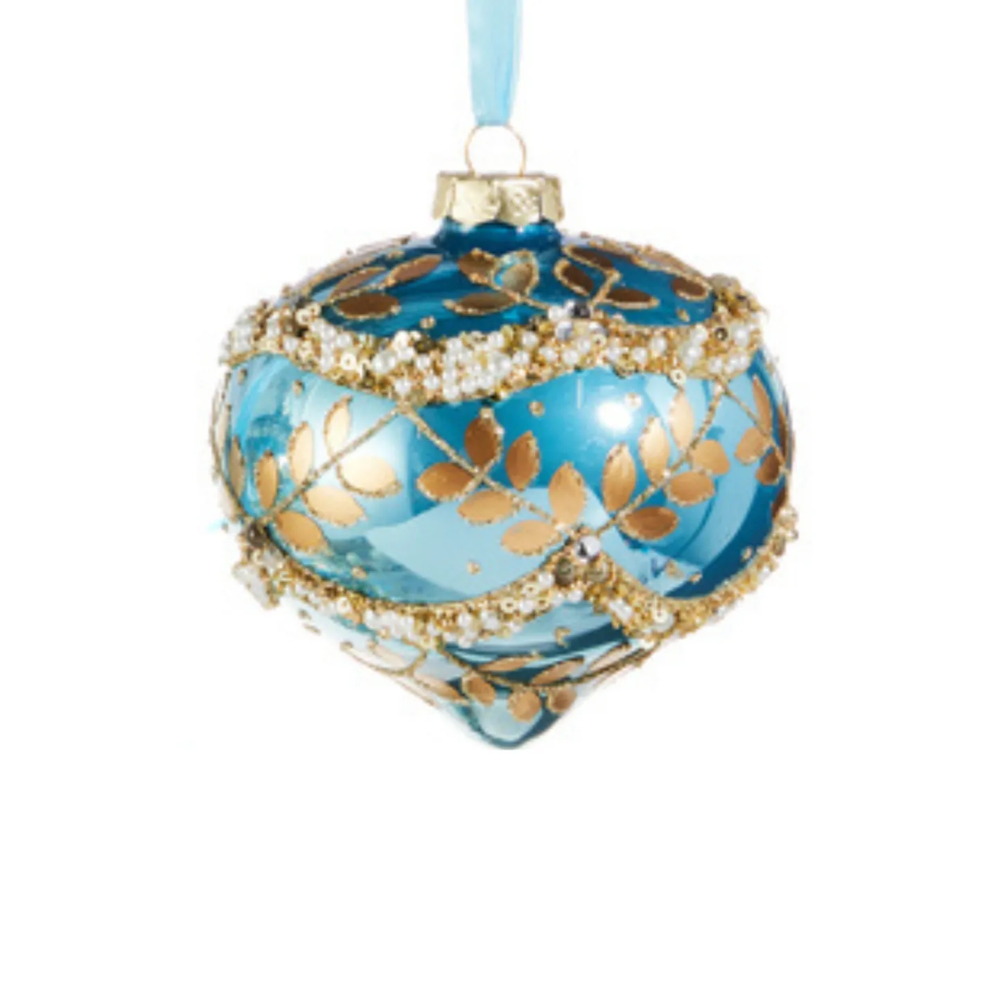 A stunning deep sea blue decorated with gilded gold leaf accents trimmed in sparkling lines of glitter and swoops of beads ad glitter! Choose your favorite if three shapes or get the set! Made by Raz Imports. Made of glass. Dimensions: 4″D X 3.75″H; 3″D X 5.5″H.