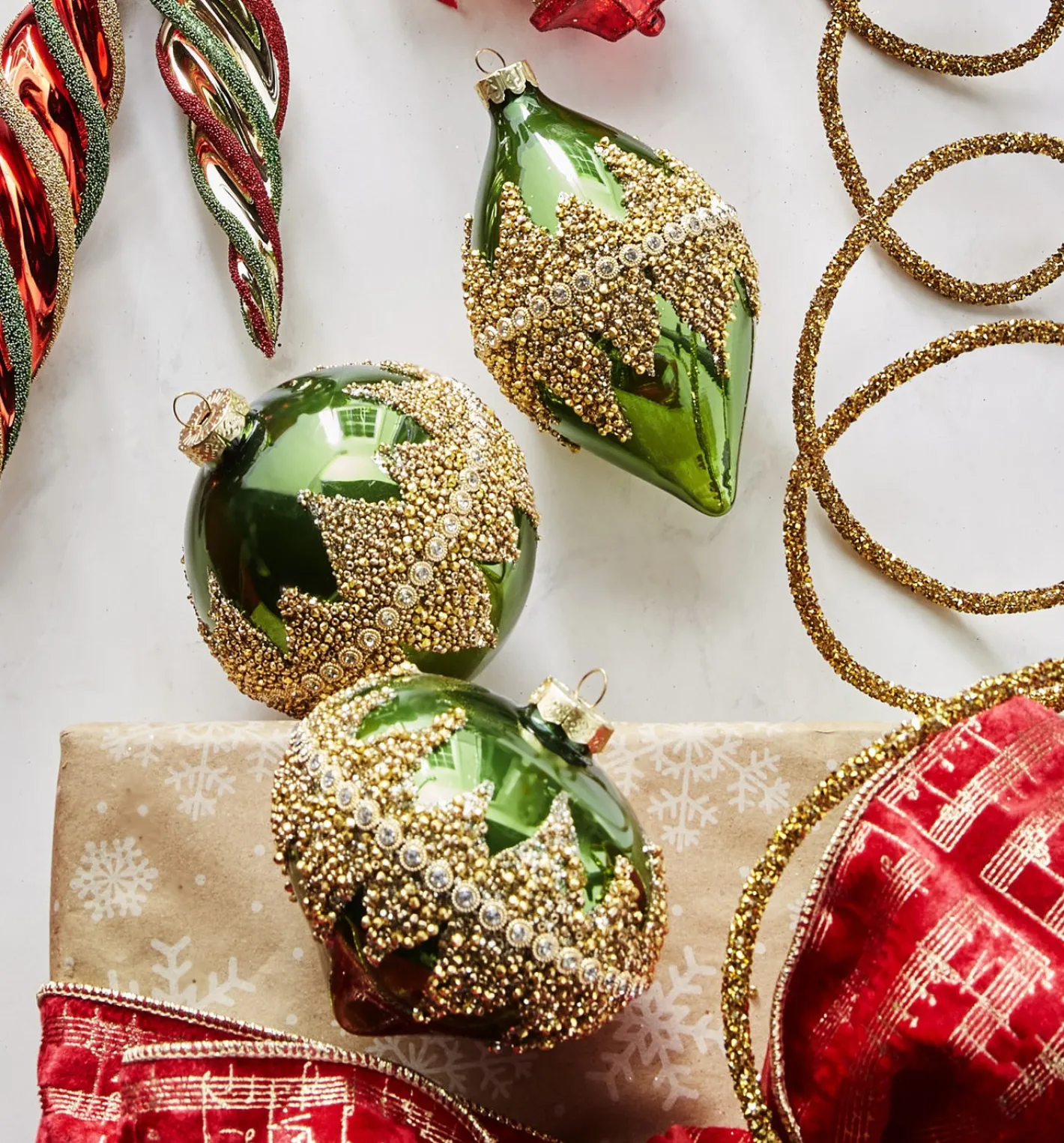 A touch of green is sure to do the trick! Add these stunning green glass ornaments to your Christmas decor this holiday season! Each one is a gorgeous shade of green with jewels encased in gold and gold beading encrusting the center! Choose one of three shapes! Each sold individually. Made by Raz Imports. Made of glass. Dimensions: 4″.
