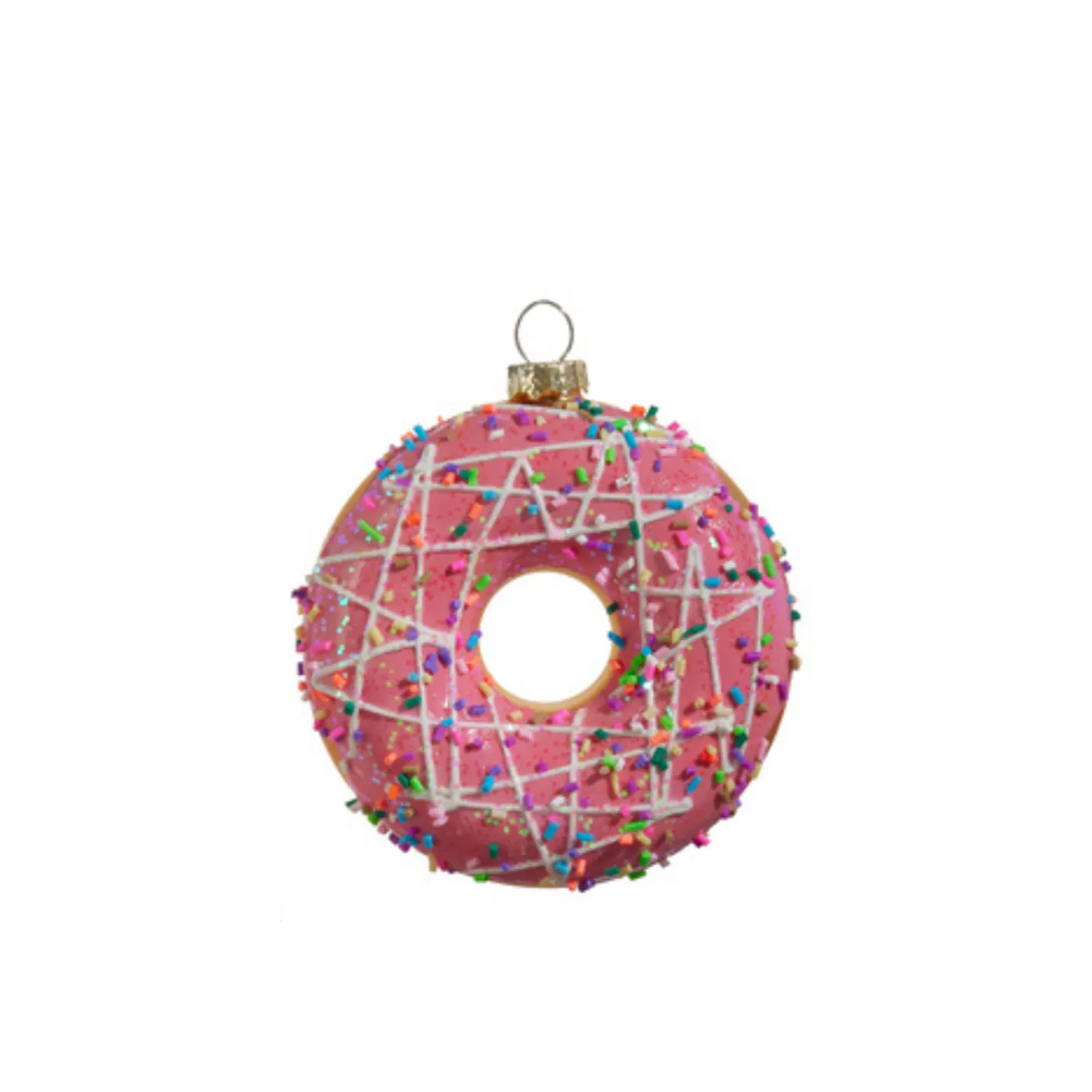 How SWEET are these?! Each donut ornament is iced with stunning pink icing dusted with iridescent glitter and colorful rainbow sprinkles! Choose light or dark pink! Each sold individually or as a set of 2. Made of glass. Dimensions: 4″.