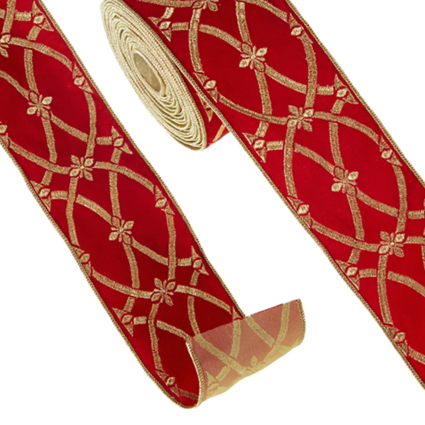 Deck the halls with this gorgeous ribbon! It features a bright red fabric with a gold metallic pattern down the length of it! Made by Raz Imports. Made of polyester. Dimensions: 4″ x 10 yards.