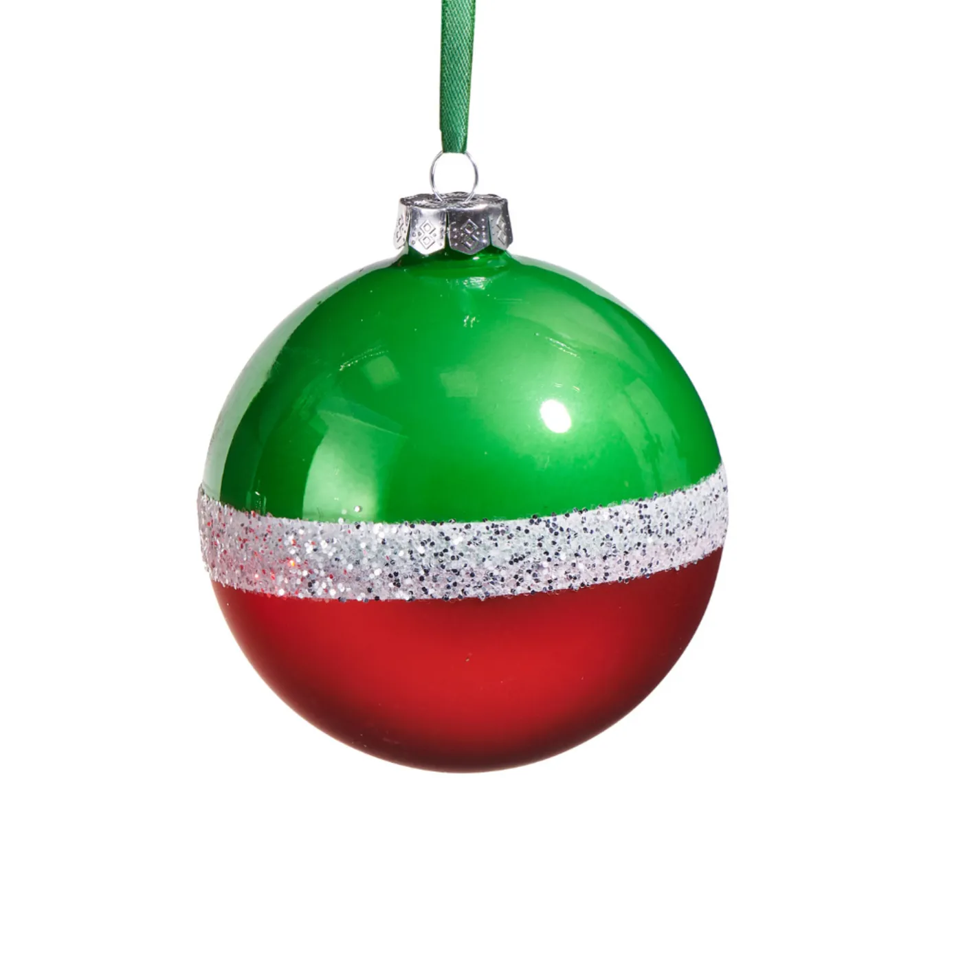 Red and green will never go out of style! Check out these gorgeous two toned glass ball ornaments with a white striped speckled with silver glitter! Made by Raz Imports. Made of glass. Dimensions: 4″.