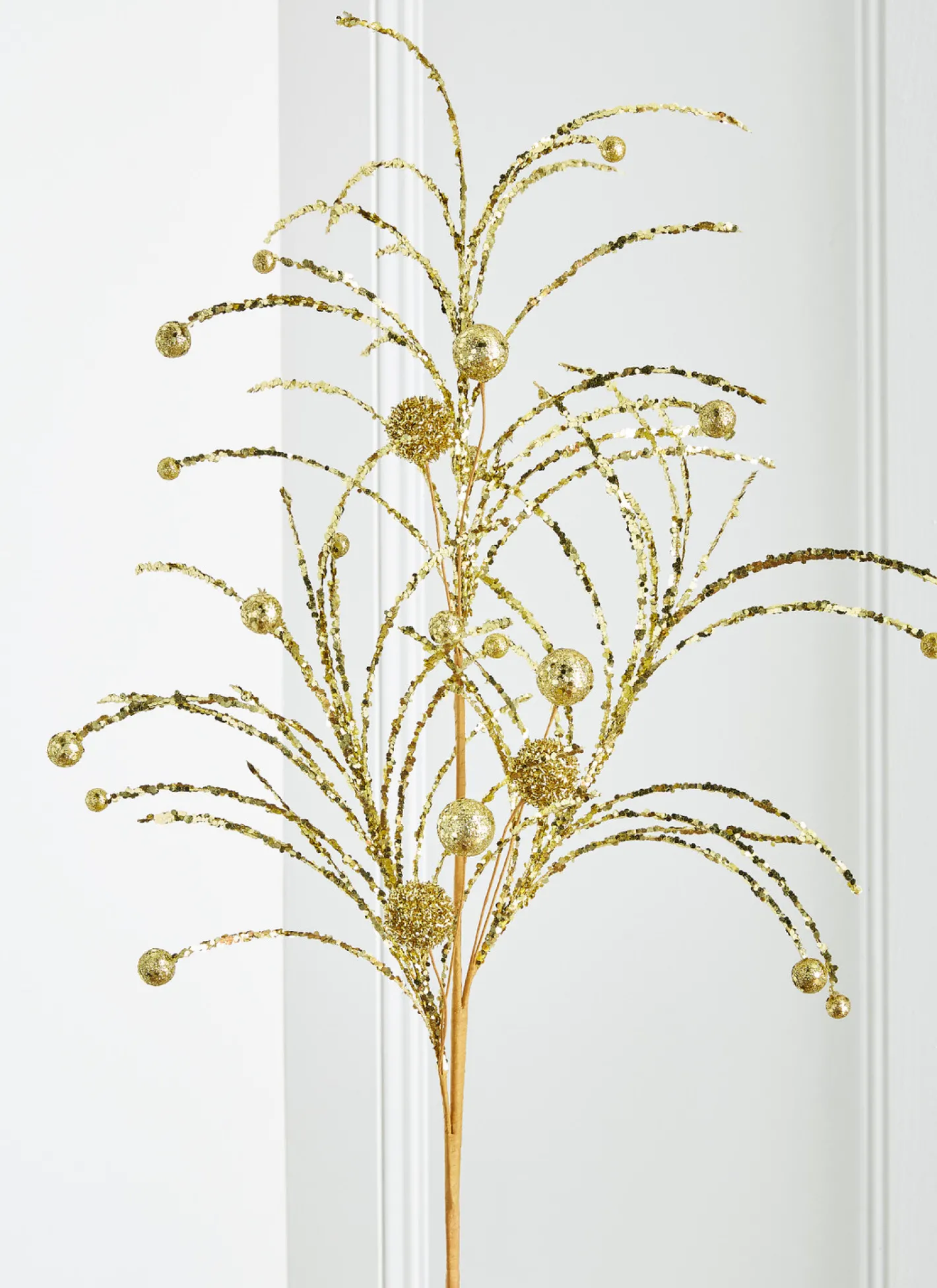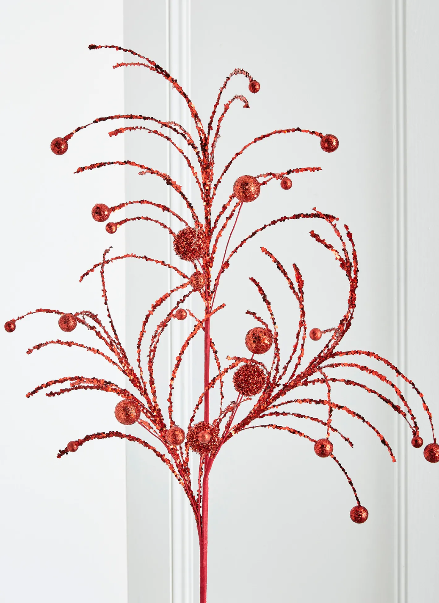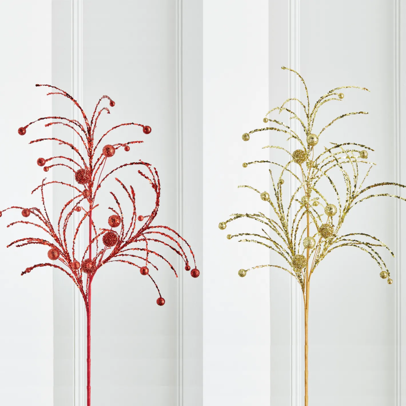 You can never have too much glitter during the holidays! Choose between a red of gold glitter spray that looks like a fireworks with flowing branches and ball ornaments covered in sparkling glitter! Each sold individually. Made by Raz Imports. Made of plastic and foam. Dimensions: 42″.