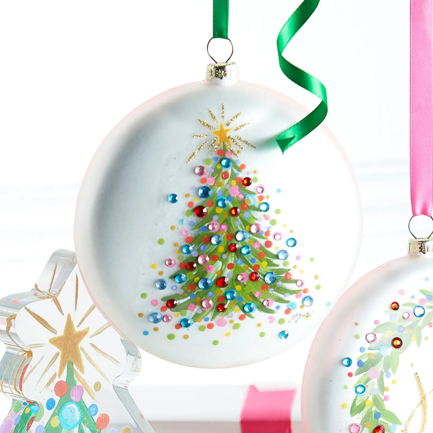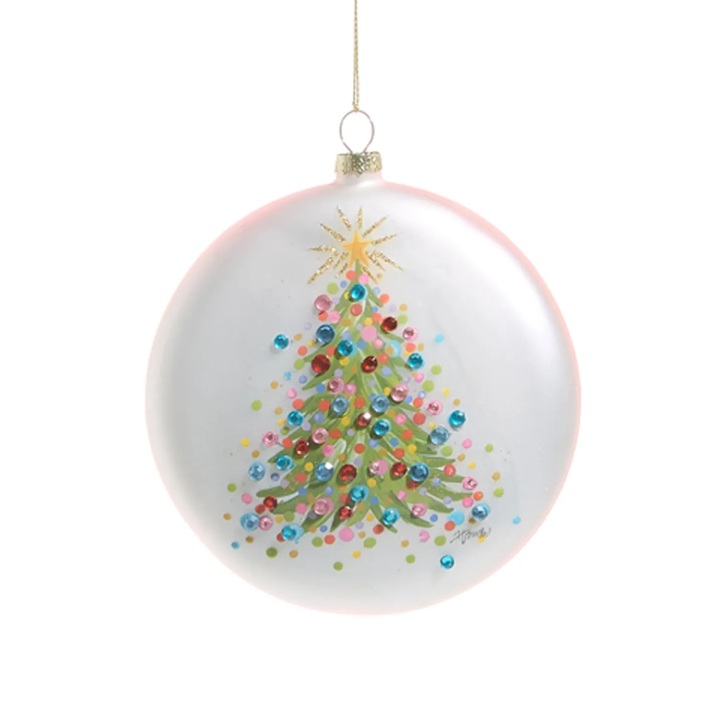 This gorgeous white disc features a fun green Christmas tree dotted with colorful rainbow beads topped with a golden star with glitter accents! Made by Raz Imports. Made of glass. Dimensions: 5″.