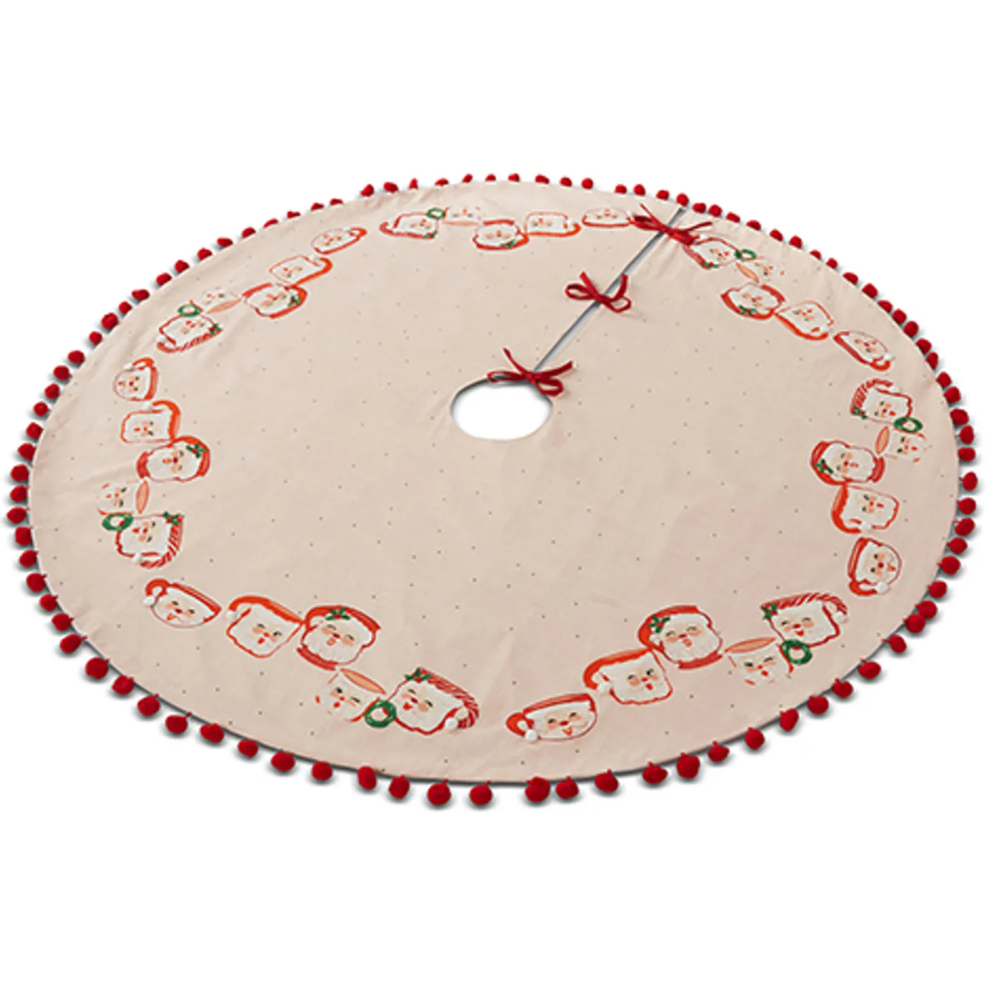 Your tree deserves to be pretty in pink this holiday! This skirt features a light pink skirt dotted with tiny black dots and trimmed in red pom pom tassels with blushing Santa mugs of different shapes and sizes! Made by Raz Imports. Made of cotton. Dimensions: 52″.