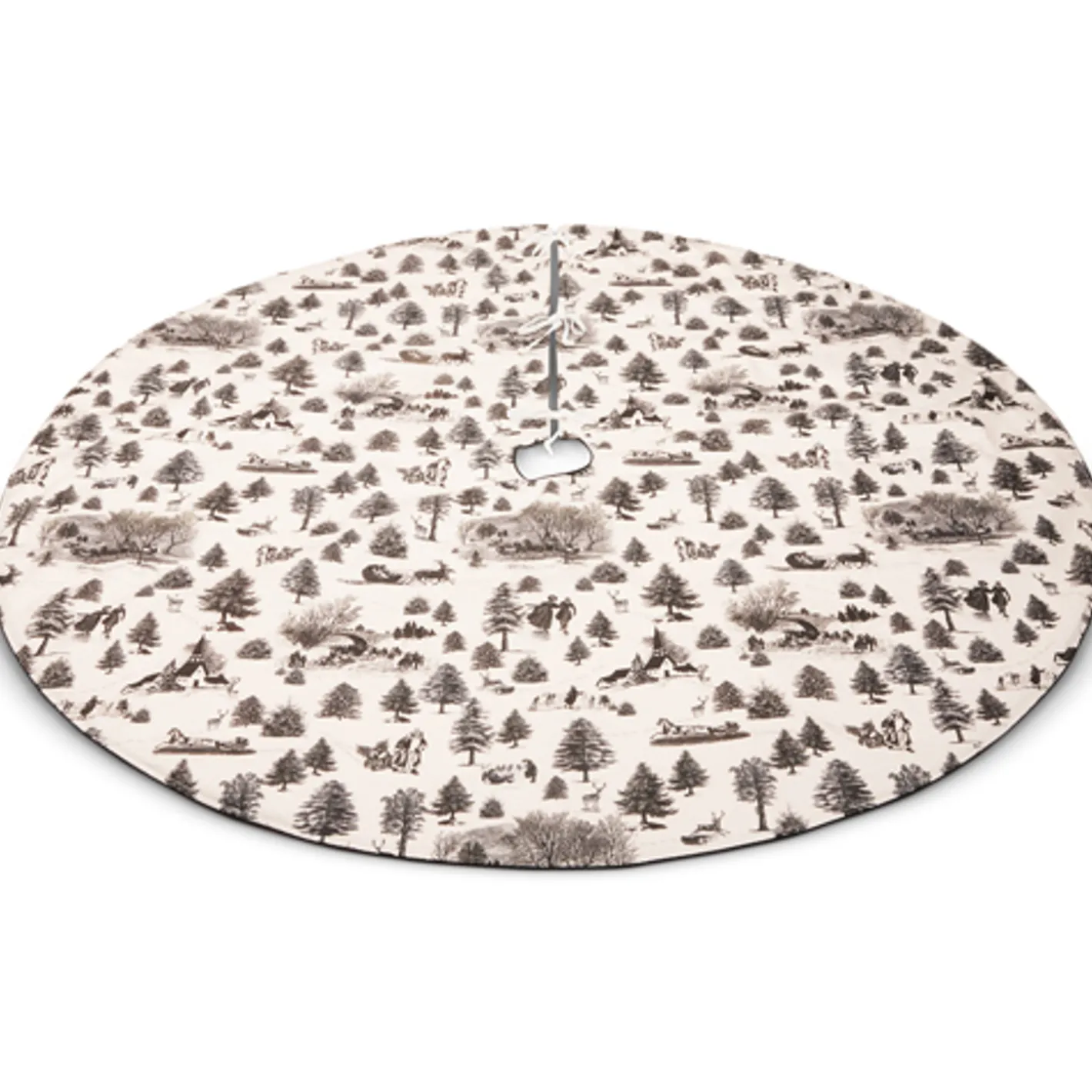 Over the river and through the woods! This adorable tree skirt features a black and white farmhouse pattern that is sure to bring a cozy vibe into your home this holiday! Made by Raz Imports. Made of polyester. Dimensions: 54″.