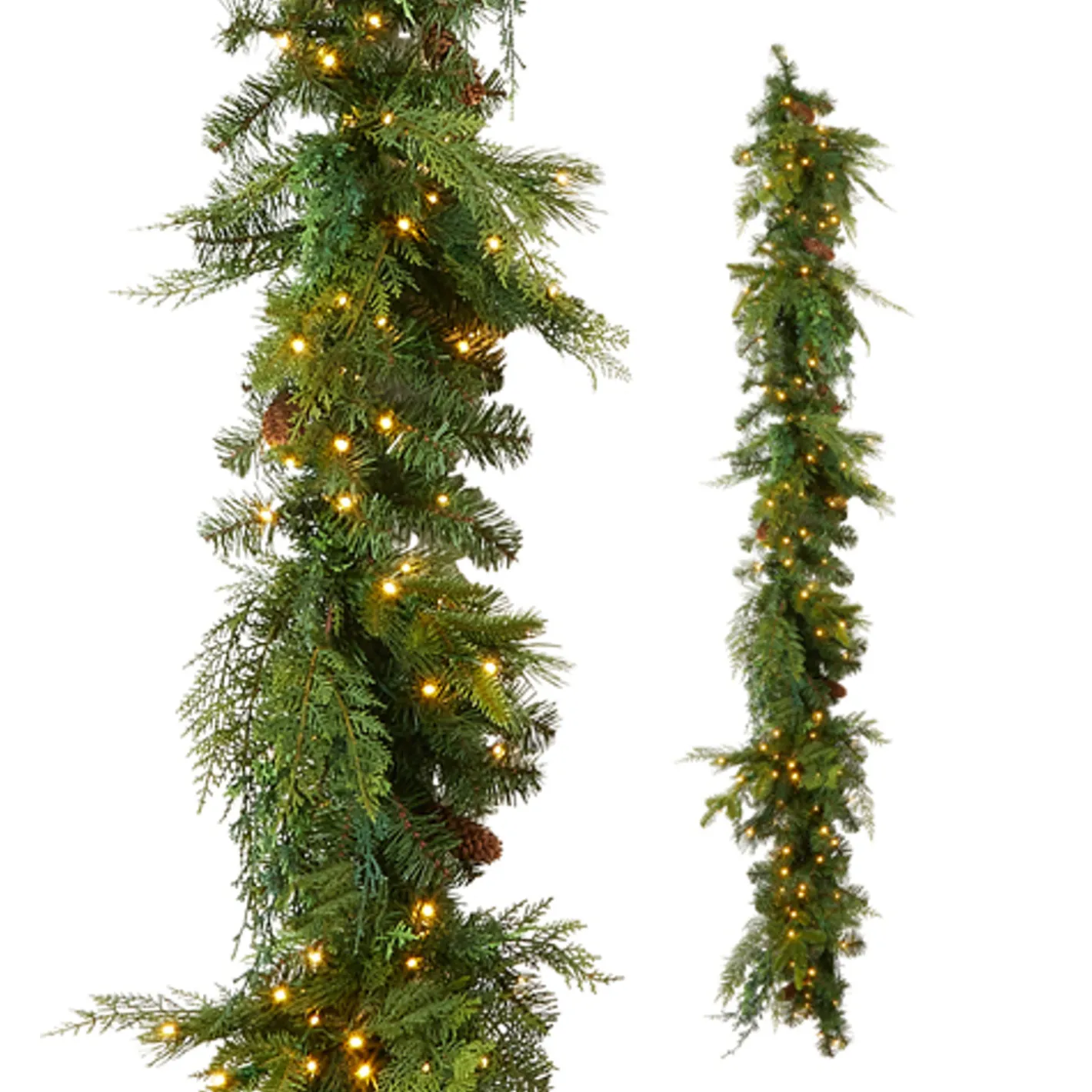 This Christmas garland has a wonderful mix of real feel and fluffy greenery dotted with small pine cones and wrapped with bright white LED lights! Made by Raz Imports.