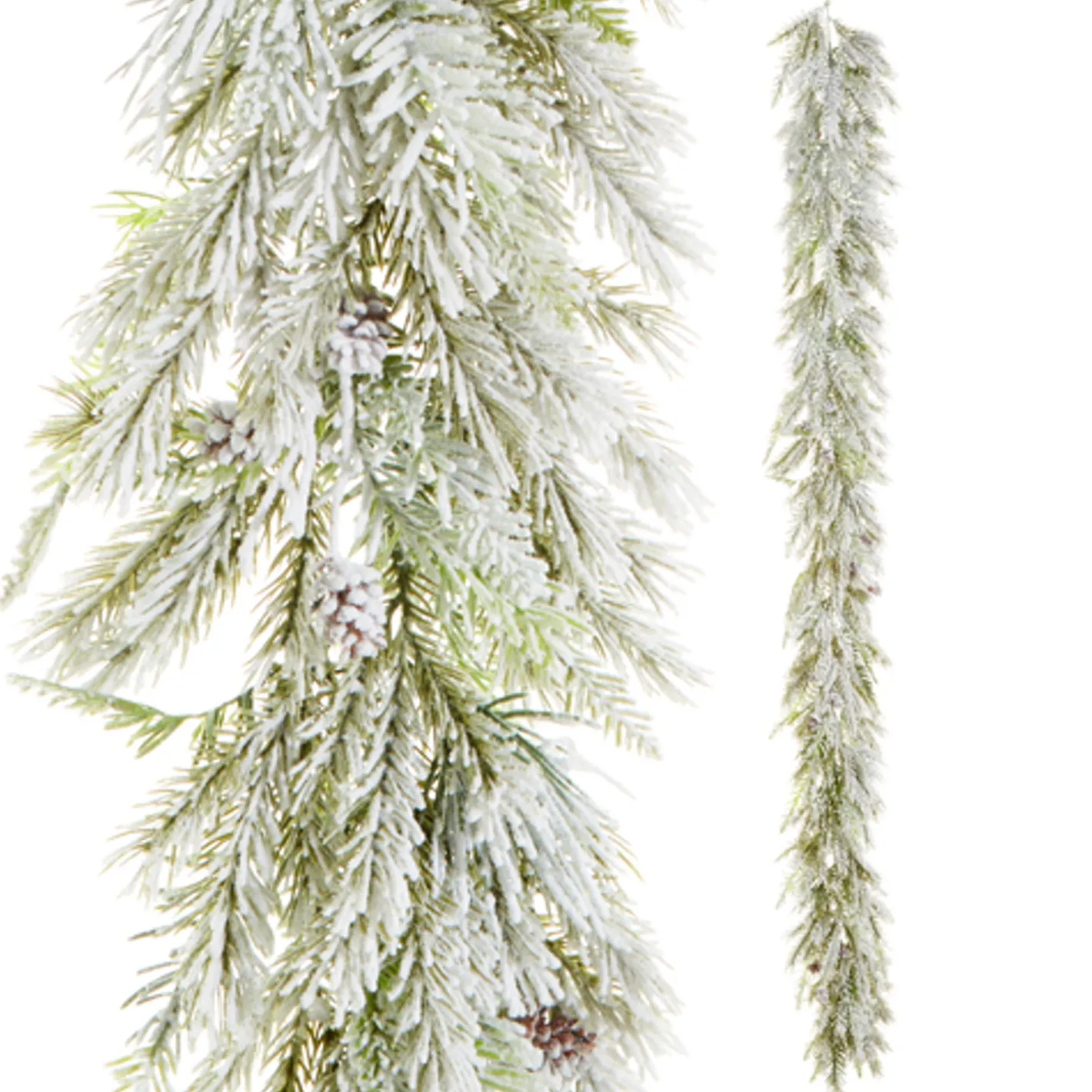 Decorate your mantle with this pretty green garland dusted with thick white snowfall and tiny pinecones dotted throughout! Made by Raz Imports. Made of plastic. Dimensions: 6′.