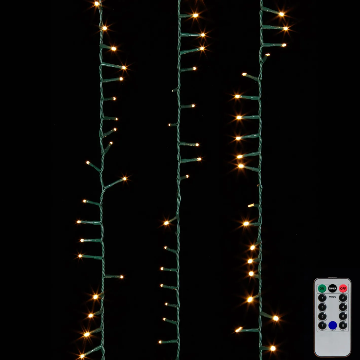 Light up your home the smartest way with our NEW and improved lights! These lights are relatively indestructible and can be used anywhere! Made of PVC. 1000 Warm White Led Lights With Green Wire. Indoor and Outdoor Use. 8 Functions. 8 Hour Timer Repeats Every 16 Hours. Includes Remote. Includes 1 DC Adapter. Lights Approx 60,000 Hours. Approx 10′ of. Wire To Adapter. Ul Certified. Dimensions: 73.8′ long. Item #: G3937039