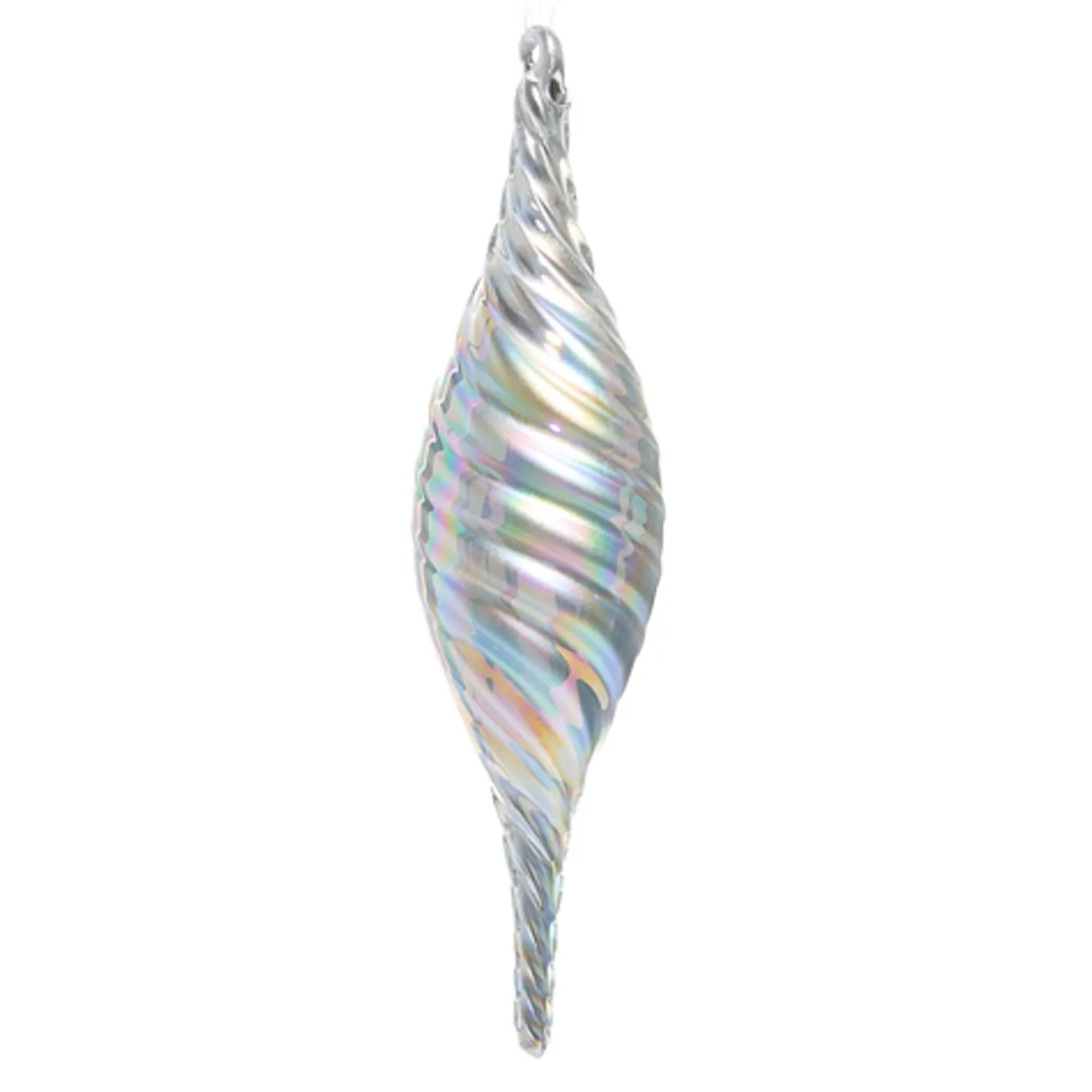 Silver always adds a stunning look to your Christmas tree! The finial features a silver swirl glass texture with an iridescent sheen! Made by Raz Imports. Made of glass. Dimensions: 2.5″ D X 9.5″ H.