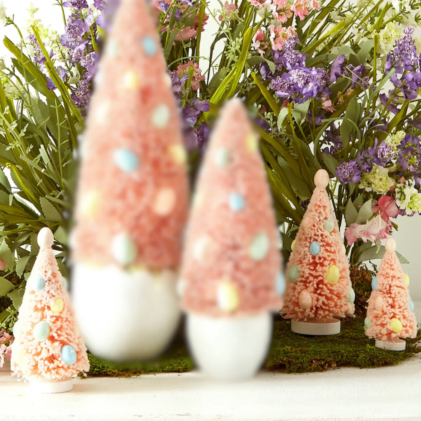 Add a bright pop of Easter color to your table set up of mantle! Each Easter tree is a lovely light pink color dotted with colorful Easter eggs! Sold as a boxed set of 3 trees. Made by Raz Imports. Made of sisal, wood, and plastic. Dimensions: 3″D X 6.5″H; 2.75″D X 5.75″H; 2″D X 4.25″H.
