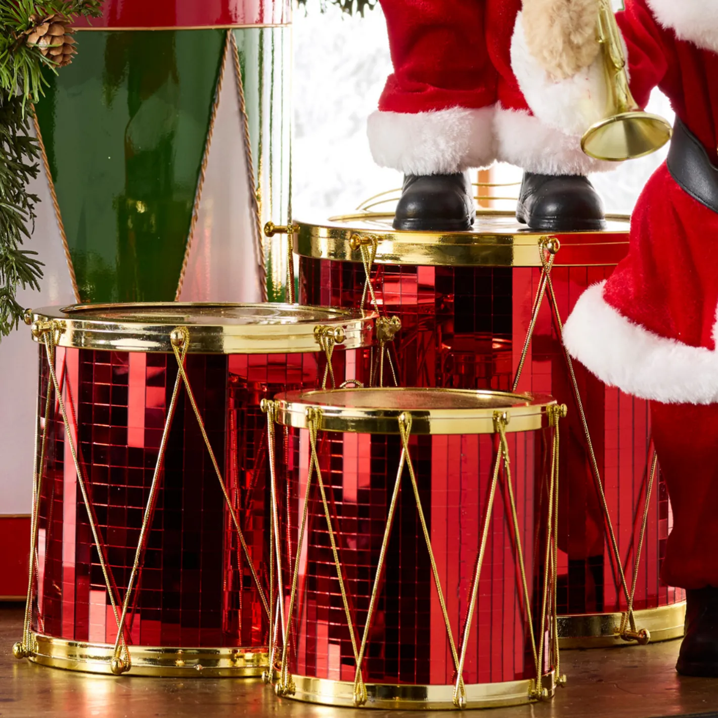 Music makes the Christmas season joyous! Decorate your tree with this trio of drums covered in red mirror tiles with a gold glitter top and golden trim! Perfect to pair with your favorite nutcracker ornaments on your tree! Sold as a set of 3. Made by Raz Imports. Made of plastic and glass. Dimensions: 9.5″D X 8.5″H; 7.5″D X 7″H; 6″D X 5.75″H.