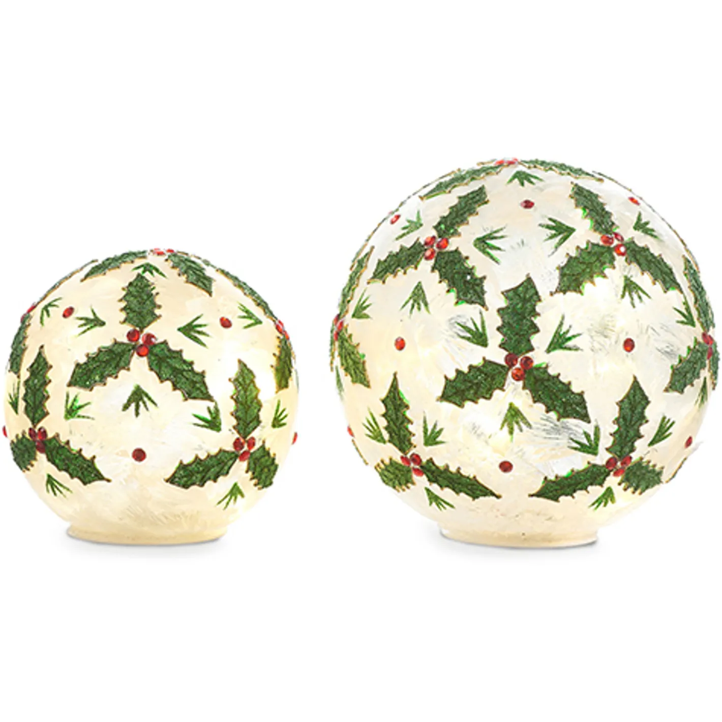 Add a pretty glow to your Christmas decor with this lovely set! It features two icy looking glass globes with green glitter holly leaves and red berry jewels! Sold as a set of 2. Requires 3 AA Batteries Each. 6 Hour Timer Repeats Every 18 Hours. Made by Raz Imports. Made of glass. Dimensions: 8″D; 6″D.