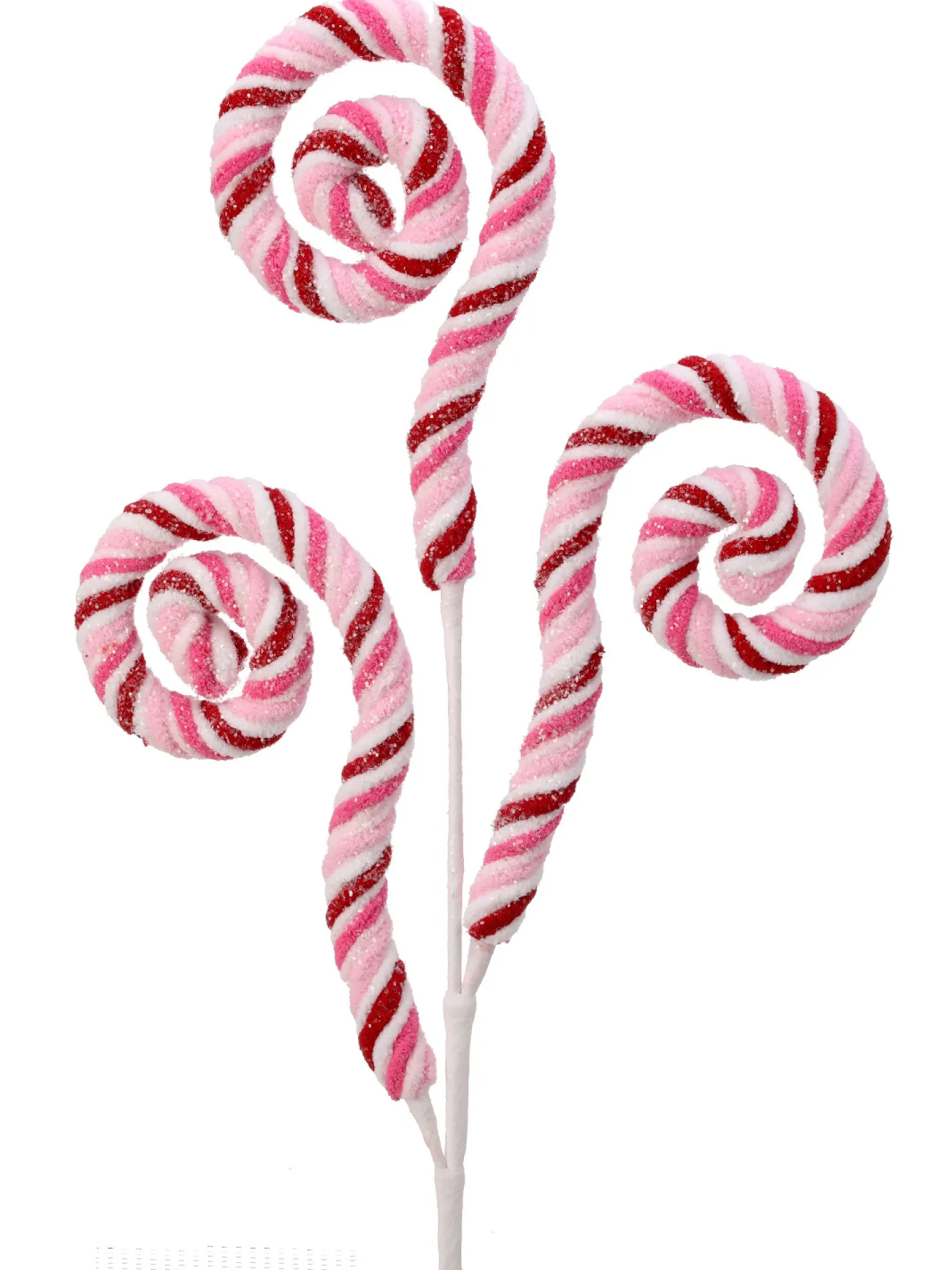 These soft curly q picks are sure to look stunning poking out of your Christmas tree or wreath this holiday season! The trio of q’s are made of red, pink, and white stripes with a fine dusting of iridescent glitter! Made by Regency International. Made of chenille. Dimensions: 28″.