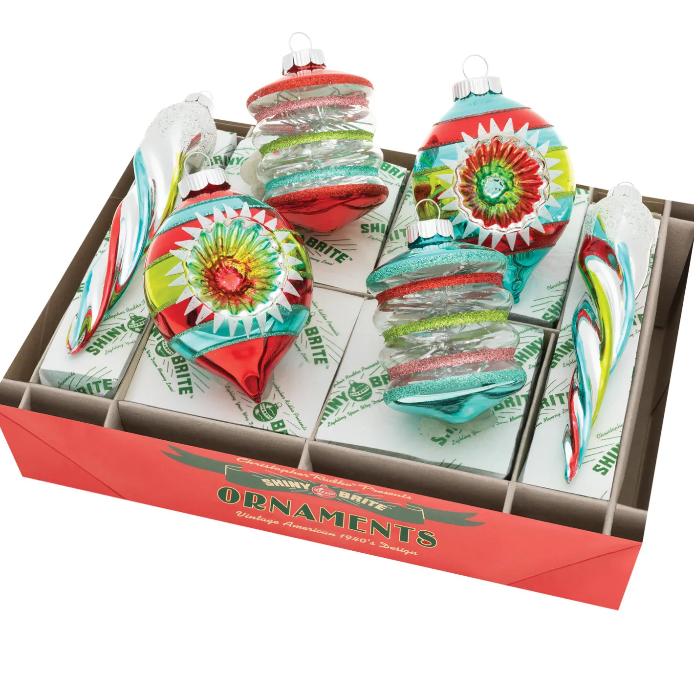 A touch of color is exactly what your Christmas decor is missing! Snag this gorgeous set of shape Christmas ornaments by Shiny Brite to add into your tree, wreath or garland! Each one has pink, green, teal, red, and silver metallics and glitter designs in shapes like tulips with reflectors, icicles, and a fun accordion shape! Shiny Brite ornaments made by Christopher Radko. Made of glass.Â