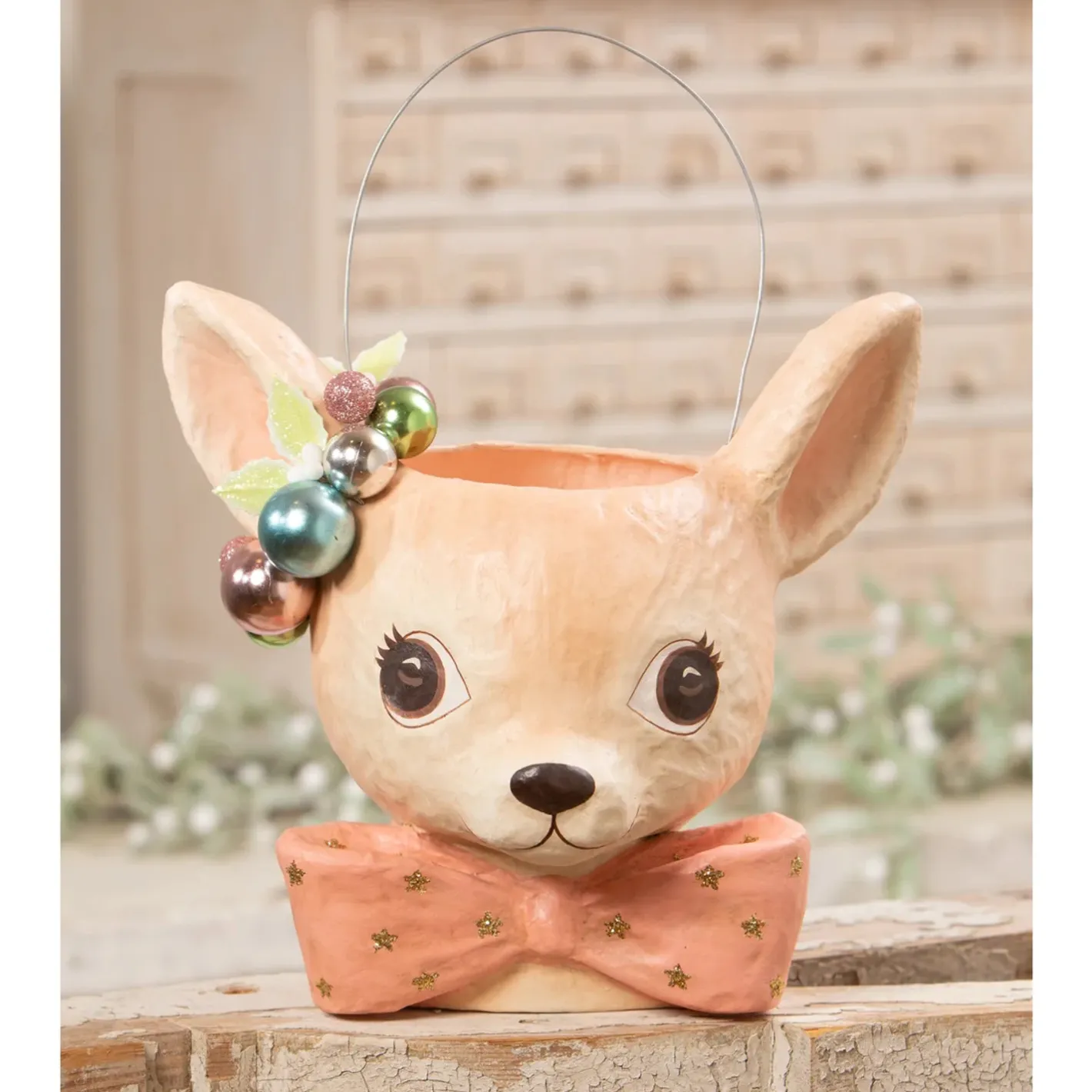 Big brown doe eyes and a light pink tone make this little fawn Christmas bucket the cutest around! She wears a dark blushing pink bow with gold metallic stars and a colorful wreath of ball ornaments around one ear! Fill with your favorite ball garland, picks or bottle brush trees for the perfect display this Christmas season. Choose small or large. Each sold individually. Made by Bethany Lowe. Made of Paper Mache, beads, holly leaves, glitter, and wire. Dimensions: small: 6.25″ X 4.5″ X 6.25″, or large: 12″ X 7.5″ X 11.25″.Â