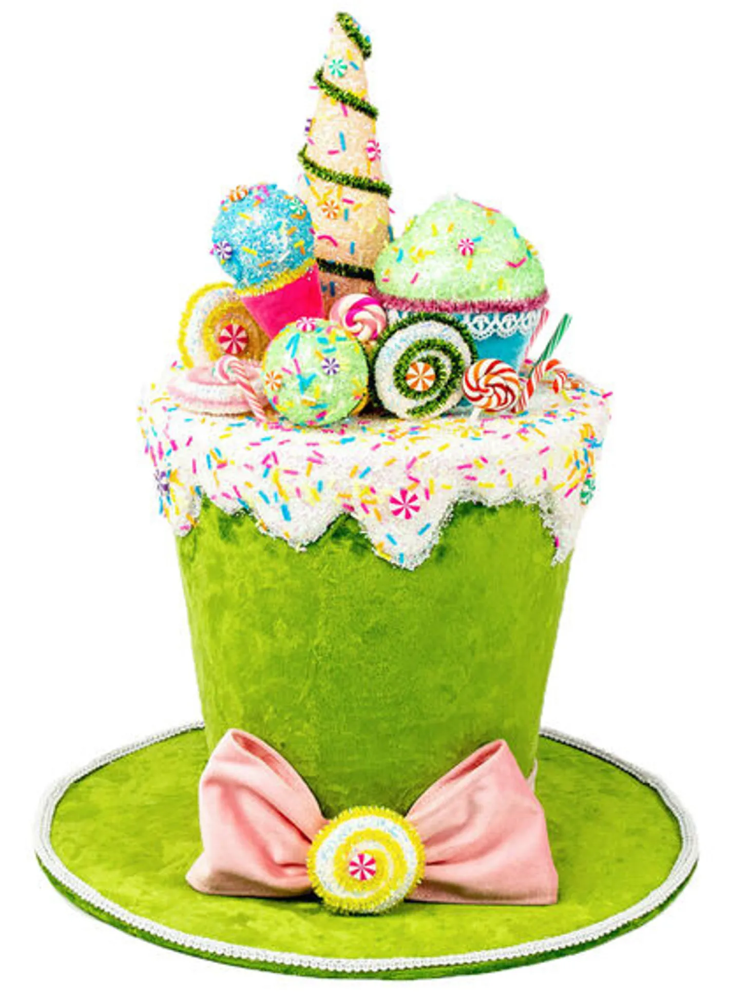 This stunning hate features a bright green velvet hat with white trim and a big pink bow decorated with a peppermint candy! The top of the hat is dripping with white icing covered in glitter and rainbow sprinkles topped with a slew of rainbow candy like a cupcake, lollipop, a tree, round candies, and an ice cream! Made by December Diamonds. Made of plastic and fabric. Dimensions: 17.5″. Item #: 08-08697