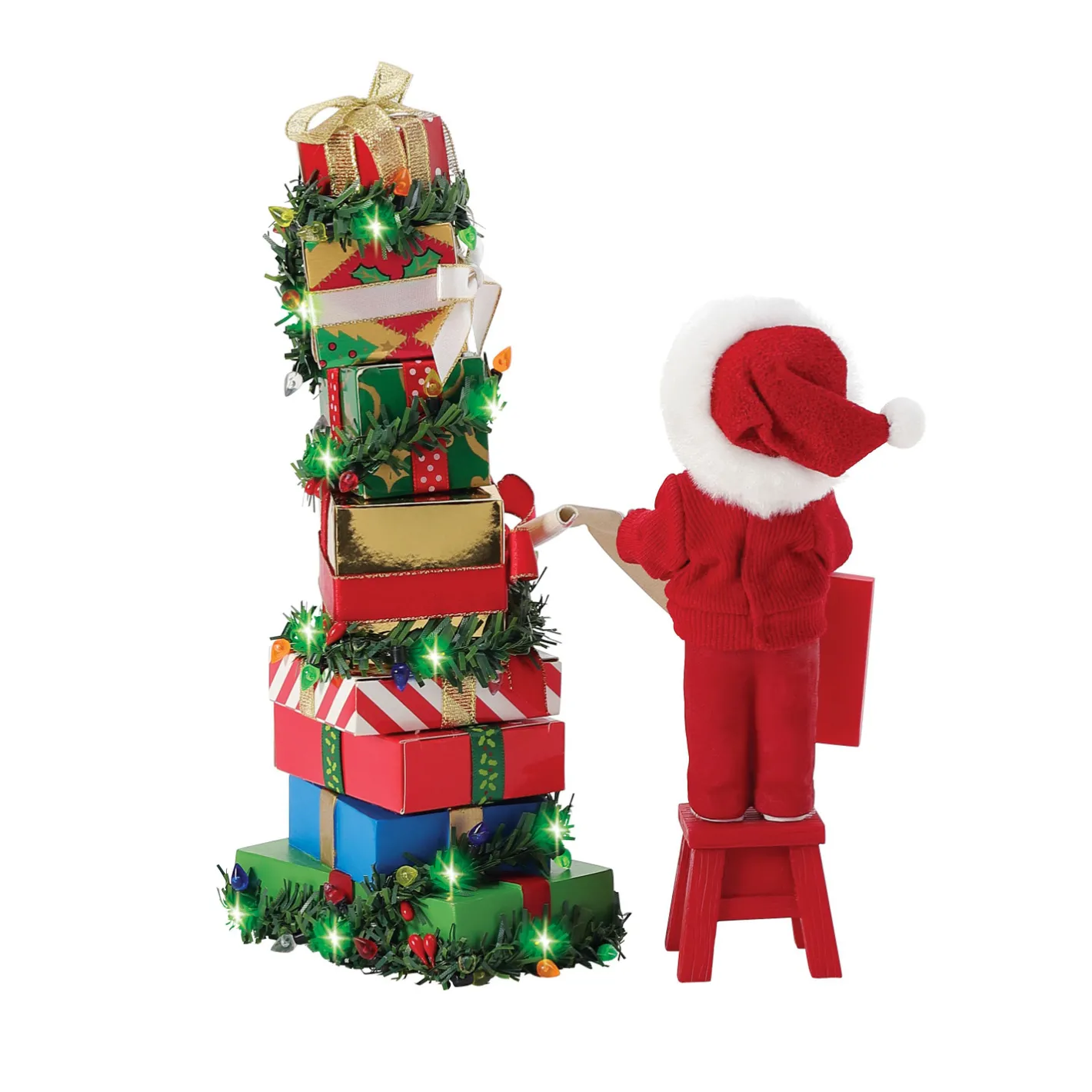We’d have a hard time waiting for Christmas too with a pile of gifts like this one! Stacked into the shape of a Christmas tree wrapped in lights and garland, this little guy stands on a stool holding his wishlist in hand and advent calendar to count down the days! LED Lights, Battery Operated 2-AAA Required- not included. Introduced January 2025. Made by Department 56. Made of PVC, Polyresin, Polyester, Clothtique. Dimensions: 9in H x 3in W x 7.5in L. Item #: 6016610