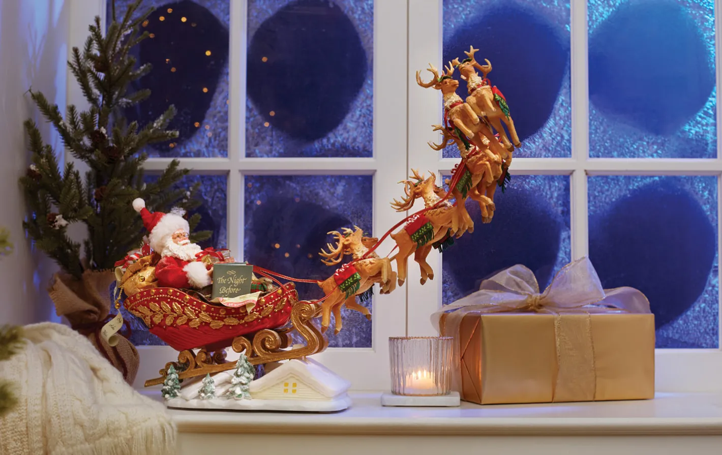 Up! Up! And AWAY! Santa takes flight in this stunning Christmas figure. At the bottom sits the rooftops of two snow covered homes as Santa’s beautiful gold and red sleigh takes flight! The Sleigh features gold leaves and gold jewels following the contours while the jolly old elf sits snugly inside with a mountain of gifts spilling out of a golden bag and he holds The Night Before Christmas story. In front of the sleigh the reindeer take off! Each one with holly decorating their antlers, ells around their neck, a red and green blanket over their back, all while being linked together with red and gold ribbon! 3 AA batteries not included. some assembly needed. Introduced January 2020. Made by Department 56. Made of resin. Dimensions: 14.5 in H x 8 in W x 19 in L. Item #: 6005284 We are an authorized dealer for Department 56 products.