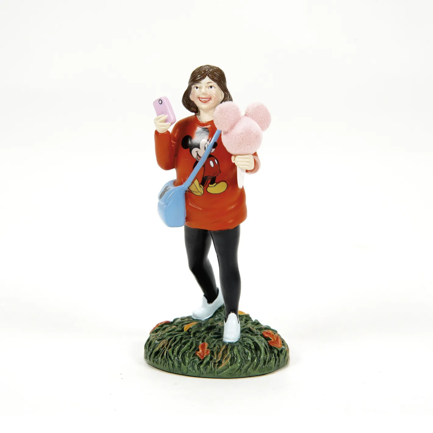 When in Disney, most people love to get decked out in Mickey shirts and ears and snap some adorable selfies to remember their trip! That’s what these Disney-goers are doing! This trio features a mom wearing a red sweater, a large blue tote, and holding a Mickey shaped cotton candy and a phone to snap a picture of her kids; a tiny girl in a white sweater taking a selfie with her Minnie ears and a peace sign; and a dad with his little on his shoulders to see the parade in Mickey ears of course! This would make a lovely addition to your Disney village- Halloween or Christmas! Introduced October 2023. Made by Department 56. Made of resin. Dimensions: 4.05in H x 1.46in W x 1.73in L. Item #: 6014559