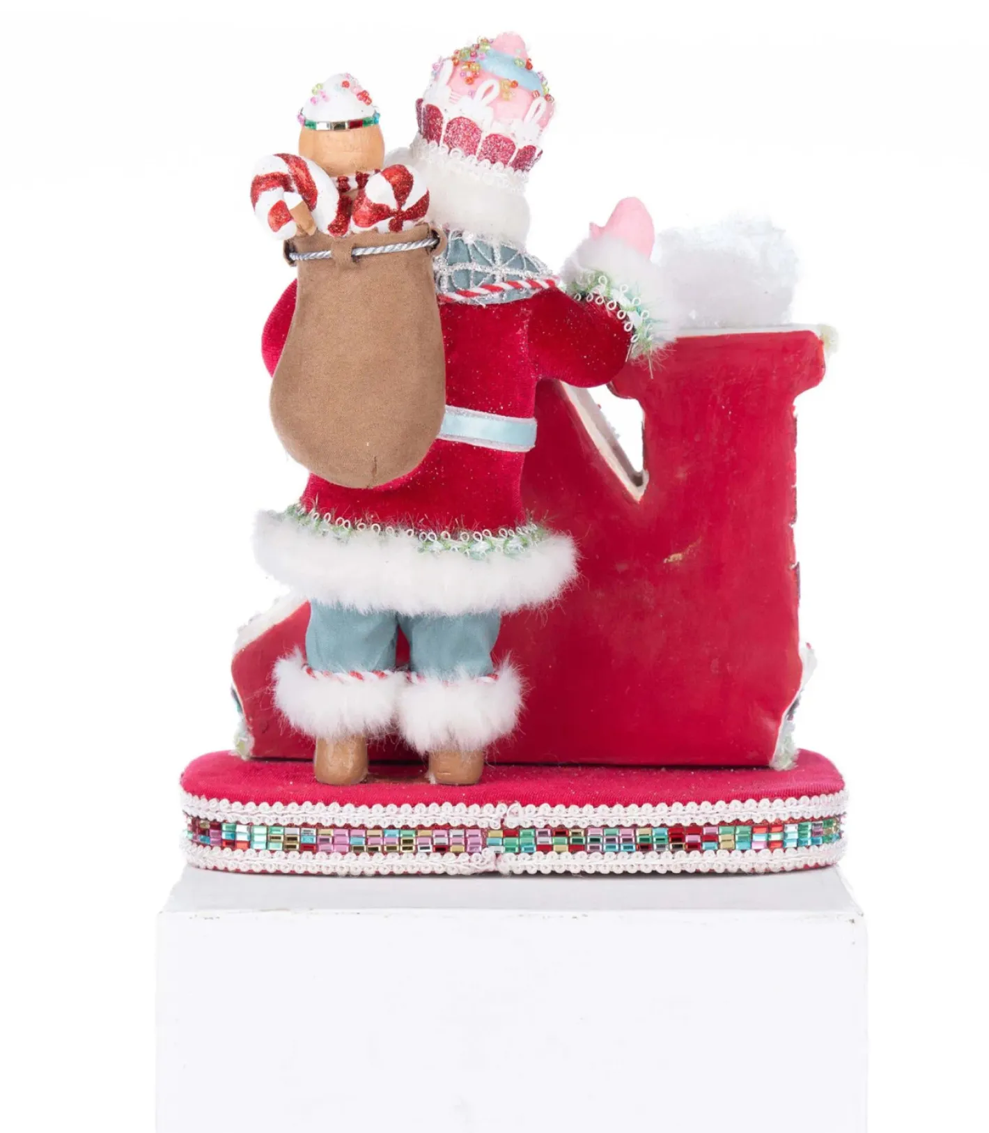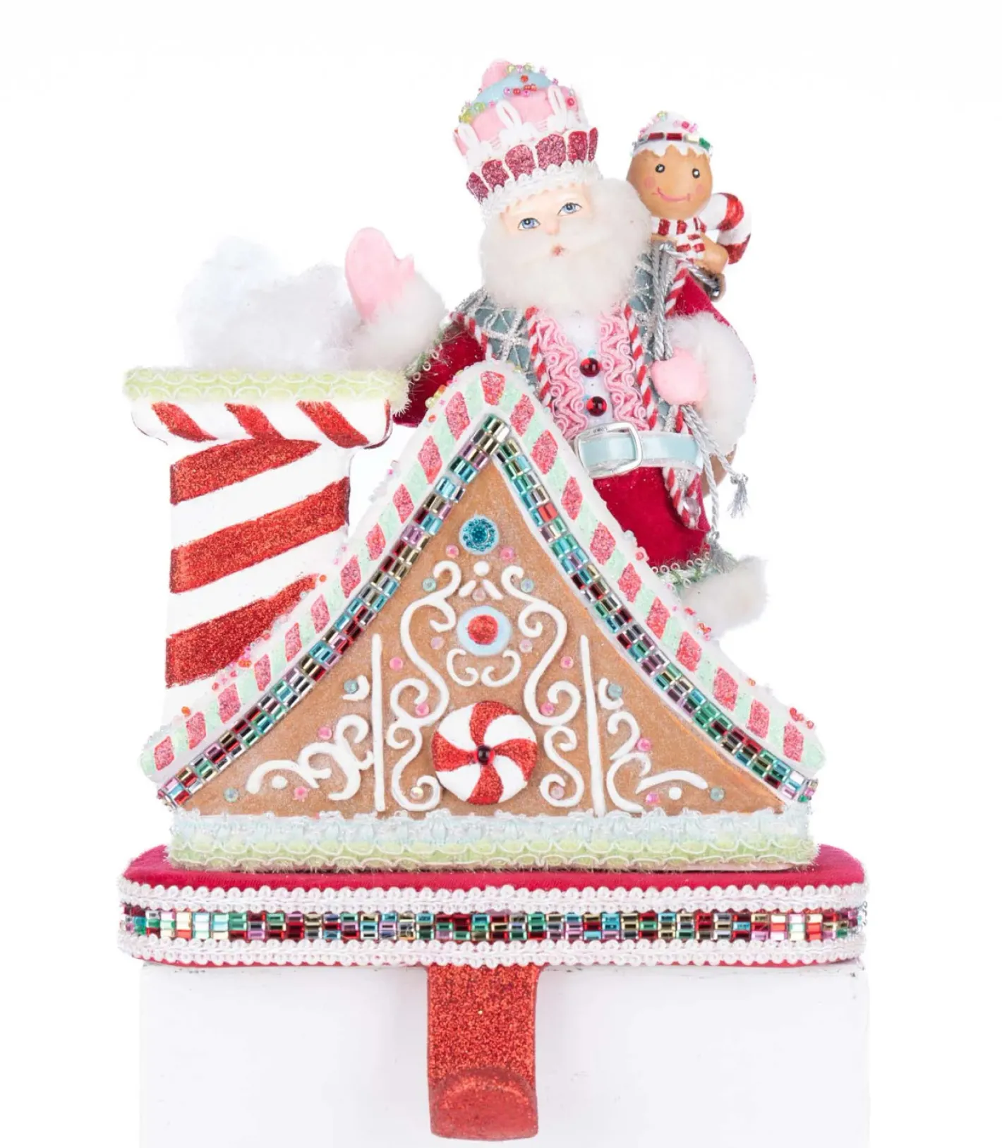 Katherine’s Collection 10.5″ Sweet Delights Santa Stocking Holder brings festive fun and sugary charm to your holiday mantel! Santa is perched atop a whimsical gingerbread house, crafted in a warm brown finish and trimmed with peppermint stripes and sparkling candy-colored gems. A red and white striped chimney peeks through the frosting-like roof, as Santa leans cheerfully against it. Dressed in a red suit accented with teal blue, soft pink, and icing-like swirls, he carries a toy-filled brown bag—complete with a cheerful gingerbread man peeking out. A colorful cake-inspired hat tops off his sweet ensemble. Finished with a glittering red hook, this stocking holder is both functional and full of holiday delight. Made by Katherine’s Collection. Dimensions: 9 × 8.25 × 10.25 in. Item #: 28-528744