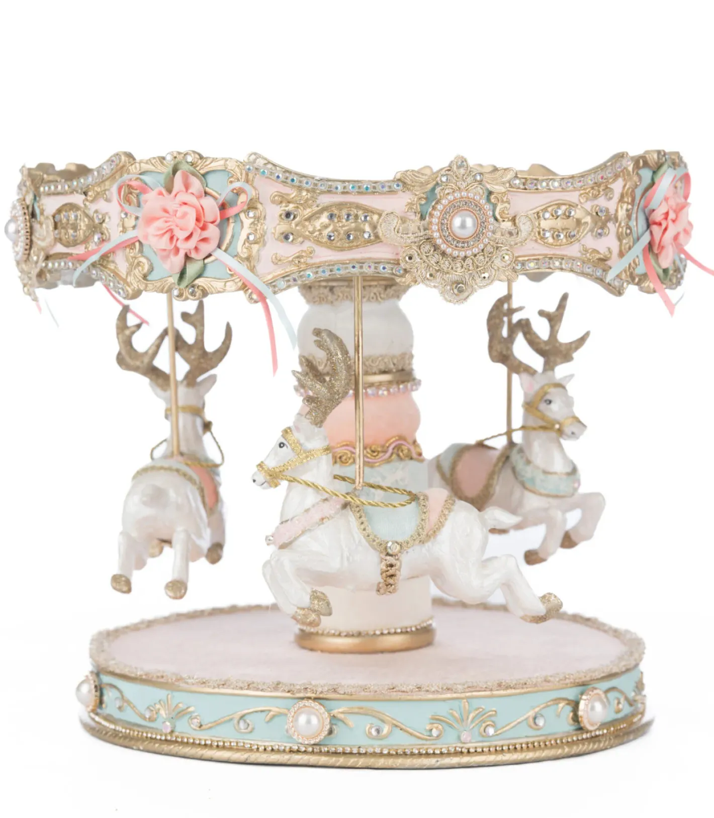 Add whimsical elegance to your holiday table with the Joyeux Noel Carousel Cake Plate from Katherine’s Collection. This delightful piece features three graceful white reindeer with gold glittered antlers, dressed in pastel pink and blue saddles, prancing around a charming carousel base. The central pole dazzles with bands of gold, pink, and blue, adorned with sparkling jewels and luminous pearls. Above, a beautifully detailed tray mimics the top of a carousel, trimmed in ornate gold, iridescent pearls, and soft floral ruffles with delicate bows. The tray surface boasts a gold lace pattern—perfect for displaying cakes, cookies, or confections in festive style. Made by Katherine’s Collection. Dimensions: 11.5 × 11.5 × 9.5 in. Item #: 28-528851