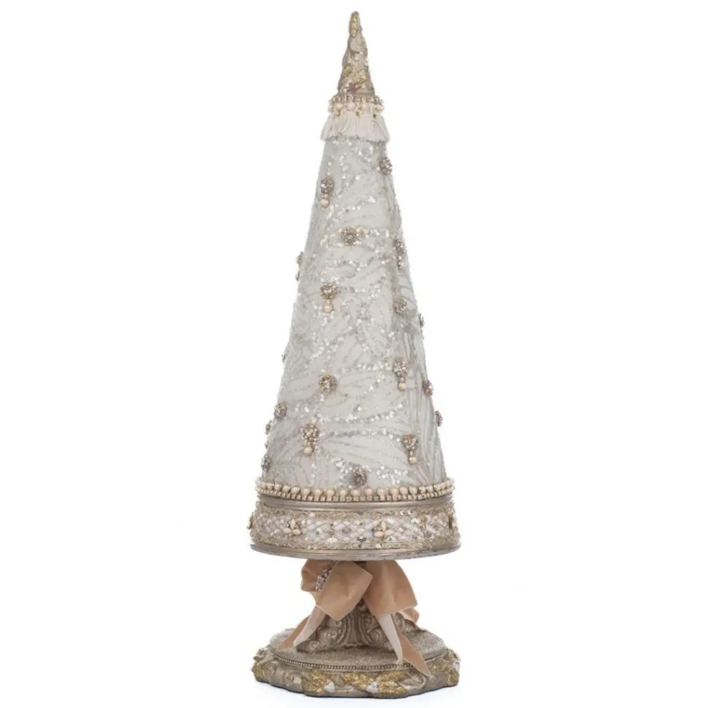 This stunning ivory tree is covered in a unique clear glitter pattern with tiny rosey gold and jeweled broaches dotting around the tree. The top is adorned with a pointed rosey gold leaf accent and lined with an ivory tassel. The base is a beautiful rosey gold with a large rosey gold ribbon! Made by Katherine’s Collection. Made of paper mache, resin, and fabric. Dimensions: 26.5 × 9.5 × 9.5 in. Item #: 28-228640