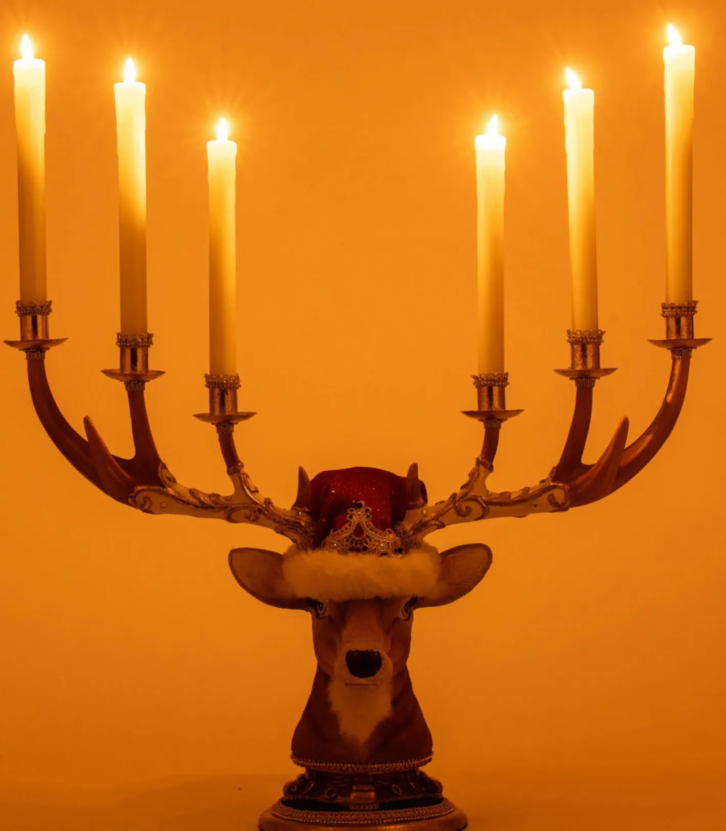 Elevate your holiday décor with regal charm using the Katherine’s Collection 26″ Royal Christmas Ball Deer Head Candelabra! This stately deer bust features soft brown eyes, delicately blushed ears, and a faux fur collar, topped with a classic red-and-white Santa hat. His majestic antlers are accented in white and adorned with intricate gold scrollwork, transforming into a luxurious candelabra that holds six gold cups—each designed to fit standard battery-operated taper candles (included) . The richly colored red, green, and gold base sparkles with jewel embellishments, making this piece a show-stopping centerpiece for any Christmas display. Made by Katherine’s Collection. Dimensions: 22.5 × 13 × 26 in. Item #: 28-528814
