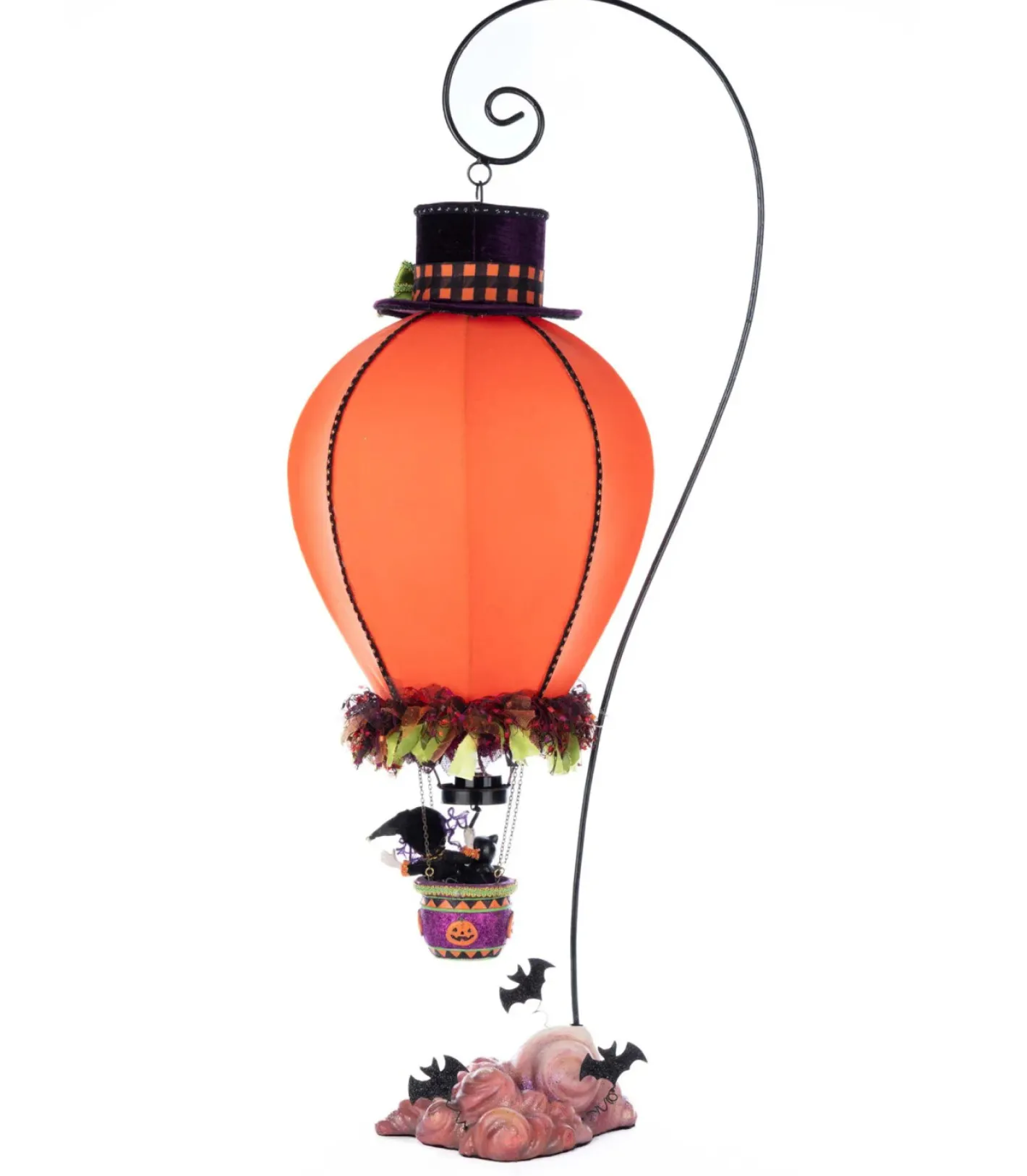 Above the Halloween night sky, a whimsical hot air balloon drifts into the unknown! The 31″ Ghoulish Hot Air Balloon features a bright orange balloon with a mischievous jack-o’-lantern face and a charming top hat. The base is adorned with frilly tulle, and a purple glittered basket dangles below, carrying a tiny witch and her black cat as they hitch a ride. The scene is completed with violet and pink clouds and a scattering of flying bats, making this enchanting decoration the perfect way to add a touch of spooky magic to your Halloween display. Battery operated. Made by Katherine’s Collection. Dimensions: 14 × 9.5 × 31 in.