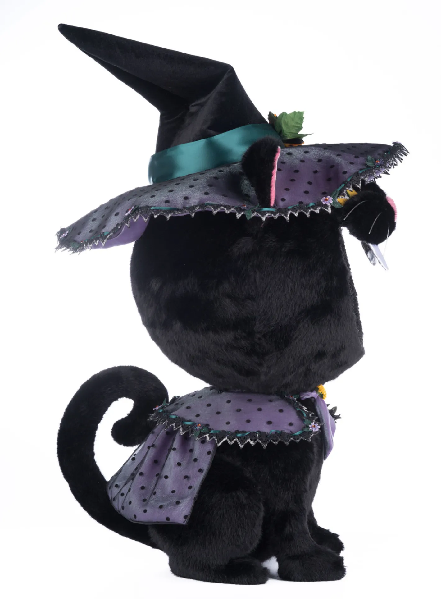 Hand out your candy in style this Halloween with this black cat candy container! A cutie black cat with a big mouth widened into a large smile with two pointed teeth showing is perfect to make all the trick or treaters or Halloween party guests smile! She has pink ears and a witch’s hat decorated with a blue ribbon and fall foliage florals! She wears a purple cape with black polka dots and black lace dotted with light purple flowers that is secured around her neck with a purple bow and yellow flowers! Made by Katherine’s Collection. Dimensions: 16.5 × 16 × 32 in.Â