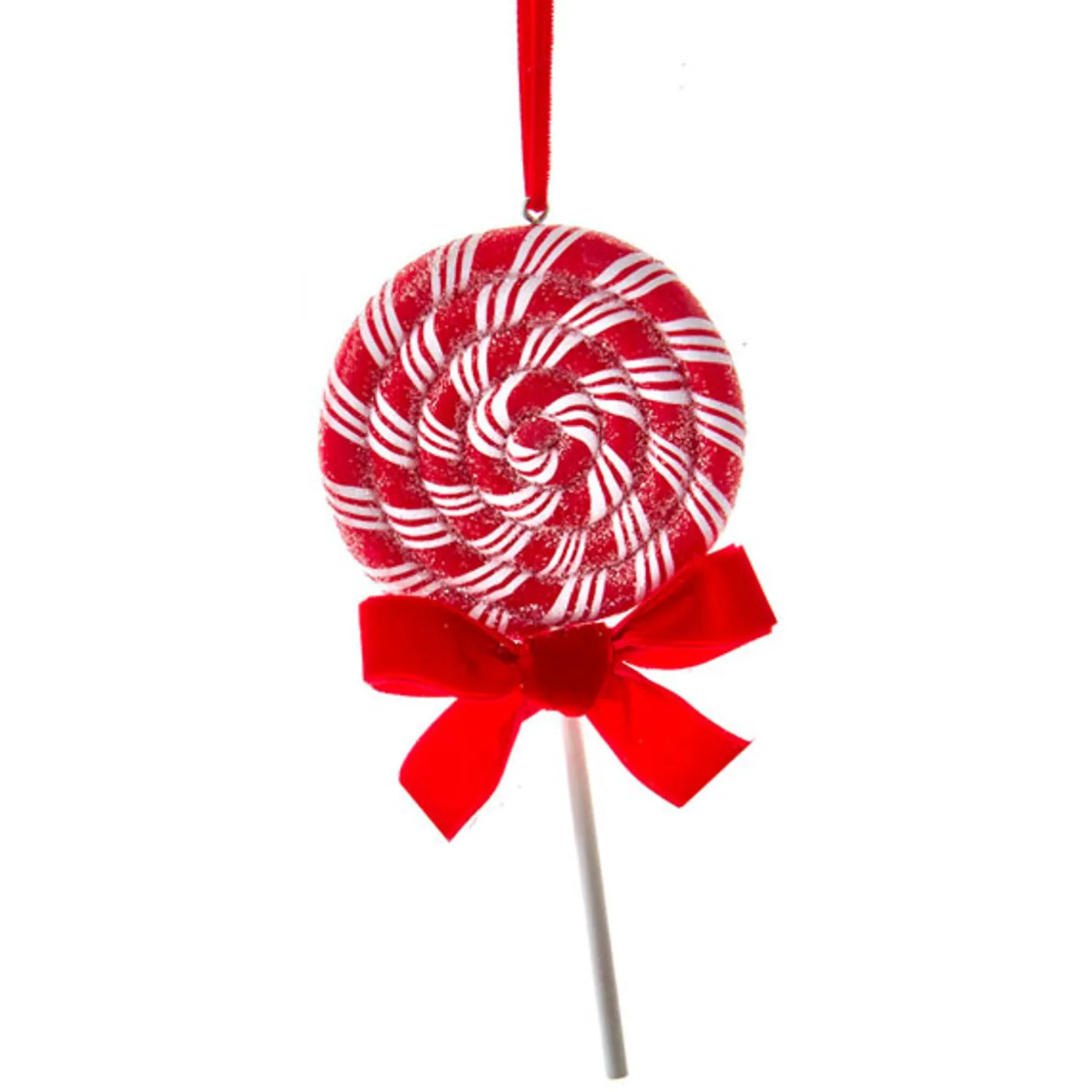 Pop a few of these peppermint striped lollipops on your tree this year for a festive look! Each one features a red and white striped swirl, dusted with glitter and tied off with a red bow! Sold as a set of 2. Made by Kurt Adler. Made of claydough. Dimensions: 6.5″.