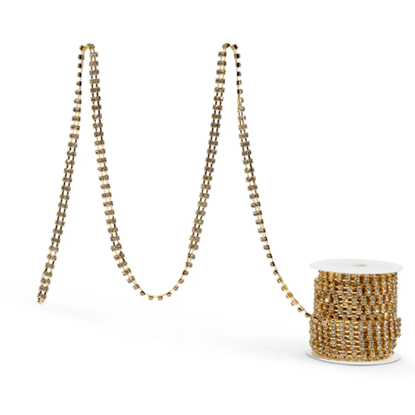 Need a lil glitz added to your glamour?? We’ve got just the thing! This spool feats 10 yards of a gold metal garland dotted with sparkling silvery white jewels! It is perfect to drape throughout your garlands and wreaths or around your Christmas tree! Made by Raz Imports. Made of plastic and metal. Dimensions: 10 yards.