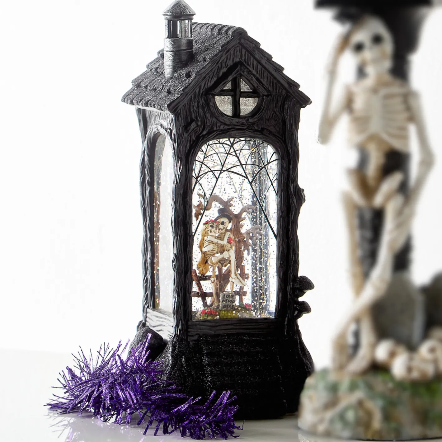 Not even in death do they part! This eerie lighted water globe lantern features a skeleton bride and groom lovingly embracing beneath a scraggly tree in their wedding attire. The black glittered lantern is designed with spider web window panes and a pitched roof that looks like a haunted house. Soft swirling light adds an enchanting, spooky glow to any room. Perfect for anyone who loves gothic romance, unique Halloween decor, or wants a conversation piece that’s sure to delight guests and trick-or-treaters alike! Made by Raz Imports.Â