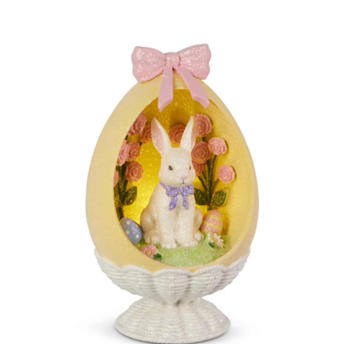 Love vintage Easter décor? This charming piece looks like a treasured find from Grandma’s collection! A bright yellow egg rests snugly in a beautifully woven white basket stand, topped with a delicate light pink bow. Peek inside the panoramic egg to find an adorable bunny with a purple bow, nestled among pink roses and colorful Easter eggs. Lightly dusted with sugar glitter, this timeless piece adds a touch of vintage charm to your mantel or holiday display! Made by Raz Imports. Made of resin. Dimensions: 7.5″ L X 7″ W X 12.25″ H.