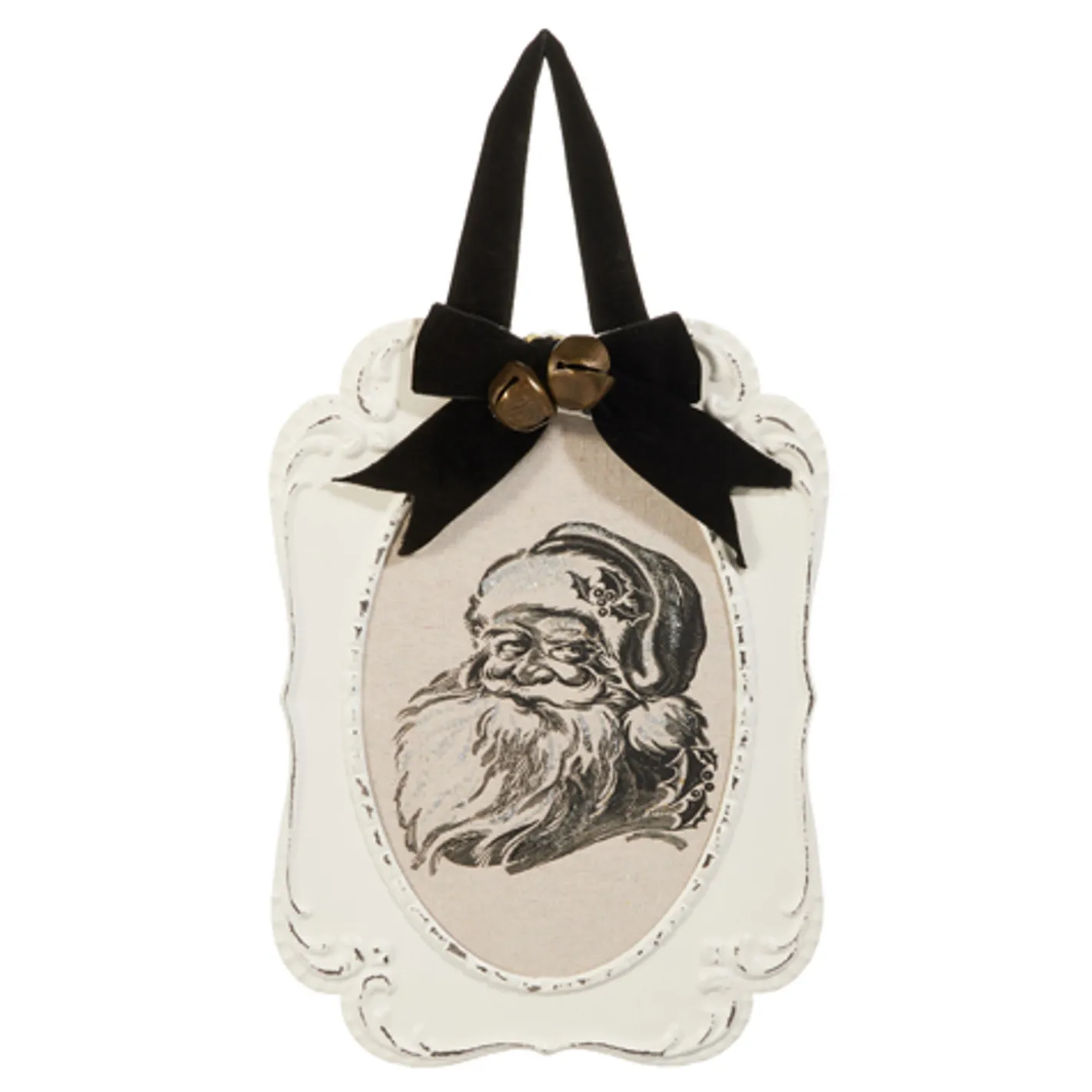 This piece features a stamp-style Santa in black in framed with a white distressed frame tied up with a soft black velvet bow and a pair of antique bells! Made by Raz Imports. Made of Iron, MDF, Linen and Velvet. Dimensions: 9″ L X 2″ W X 12″ H.