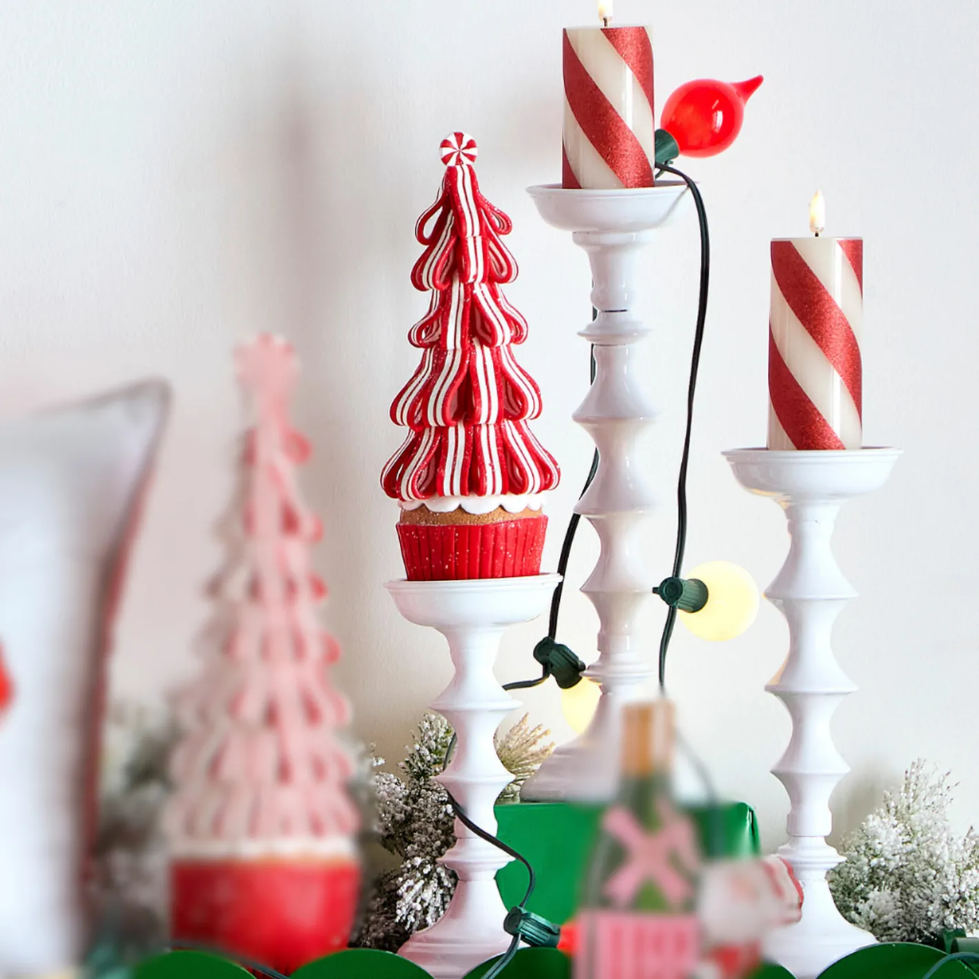 Show off your holiday candles in style with this trio of white candle holders! Each one has a base that holds a standard sized pillar candle perched on a tall pole! They are perfect to line along your mantle this Christmas! Holds a standard sized pillar candle. Sold as a set of 3. Made by Raz Imports. Made of iron. Dimensions: 4.5″D X 13.5″H; 4.5″D X 11.5″H; 4.5″D X 8.75″H.