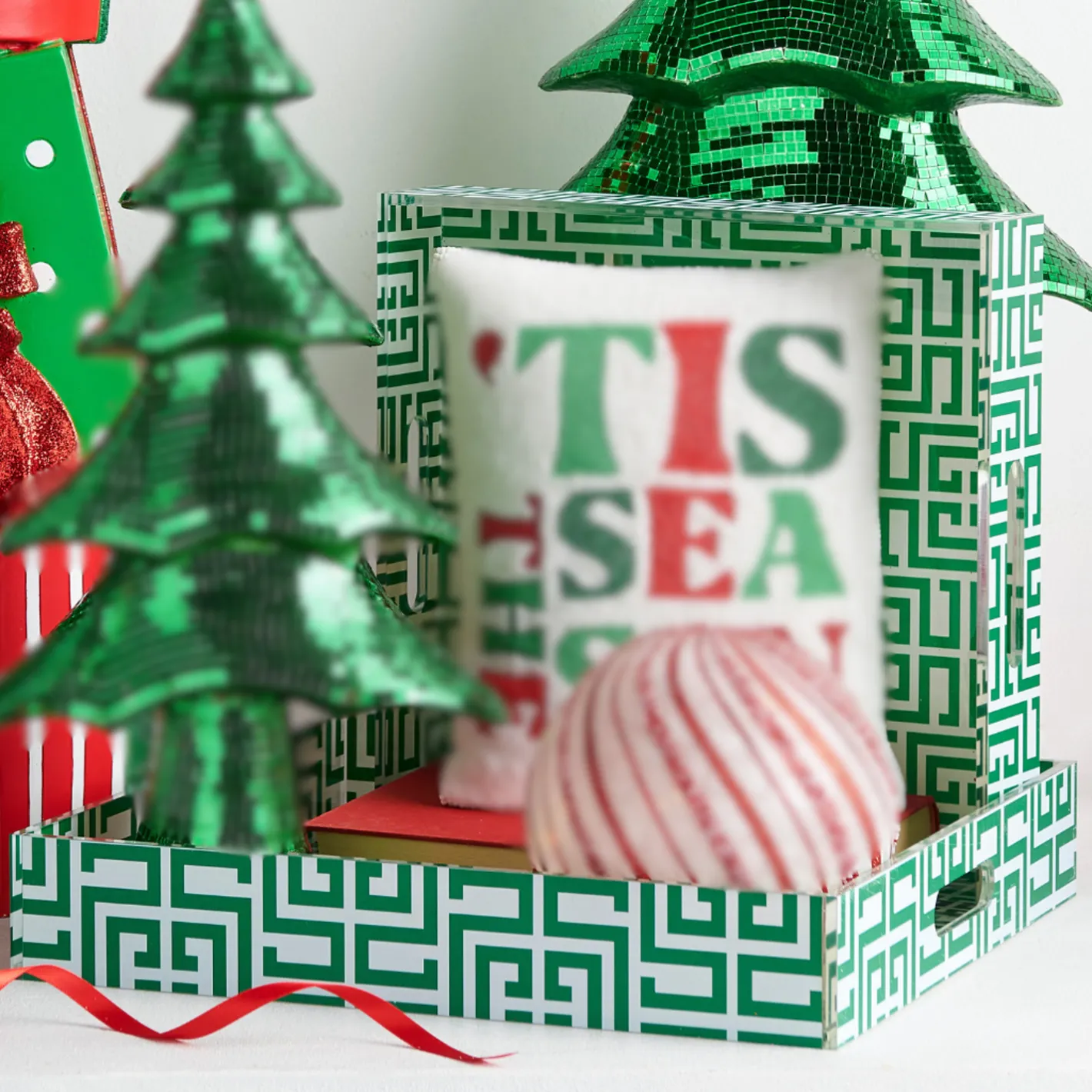Use these gorgeous trays to elevate your coffee table this Christmas! Each one has a fabulous green and white greek key design and is perfect to place a few battery operated candles and your favorite Christmas figure! Made by Raz Imports. Made of resin. Dimensions: 14″L X 14″W X 2.5″H; 12″L X 12″W X 2.5″H.