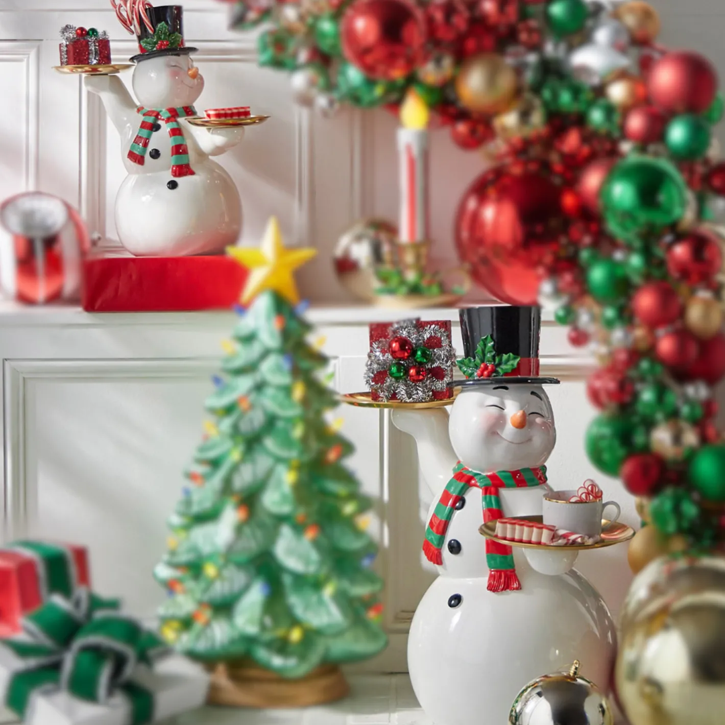 Here come the desserts! Each serving snowman has a smiling face and rosy blushing cheeks with a carrot nose! A red and green striped scarf is tied around each of their necks and a top hat! In each hand they hold a golden cake plate to serve up sweets, treats, and appetizers! Each sold individually. Food safe. Hand wash only. Made by Raz Imports. Made of Dolomite and Iron. Dimensions: 12″ L X 9″ W X 16″ H or 17″ L X 13.5″ W X 25″ H.