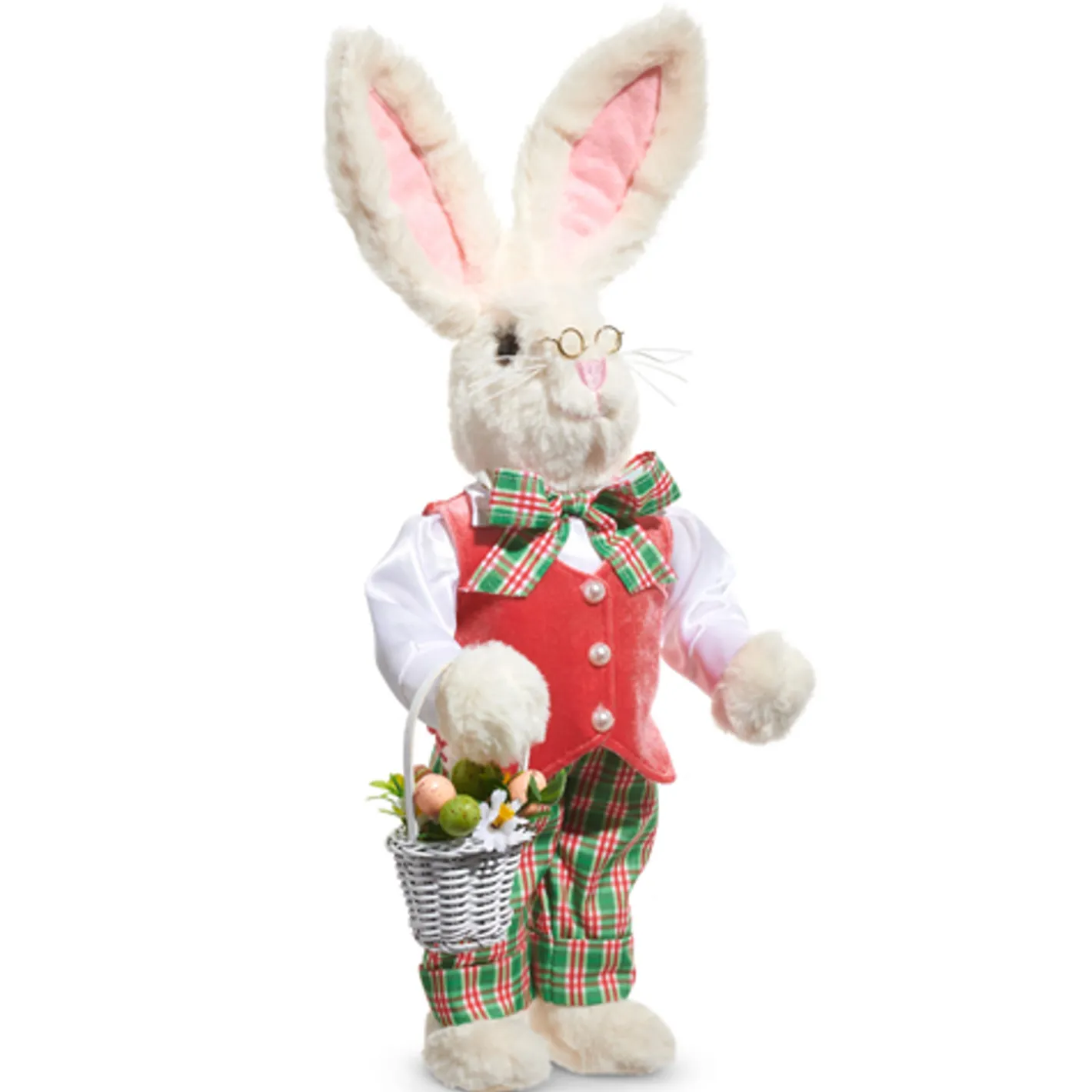 Everyone loves a lovely walk on a beautiful spring day—even the Easter bunnies! This delightful Mr. and Mrs. Easter Bunny couple is dressed in charming plaid outfits, complete with matching red vests adorned with pearl button detailing. Each bunny carries a basket brimming with vibrant spring flowers, adding a fresh and festive touch to your Easter dĂ©cor. Sold as a set of two. Made by Raz Imports Made of polyester and plastic. Dimensions: 9″ L X 6″ W X 17″ H and 8″ L X 4.5″ W X 17″ H.Â