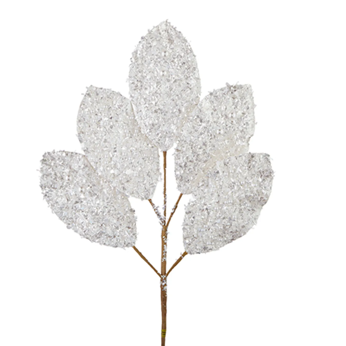 It’s time to add some BLING BLING! To your tree this year! This pick features large, flat magnolia leaves encrusted with glitter in a stunning white! Made by Raz Imports. Made of polyester and plastic. Dimensions: 23″.