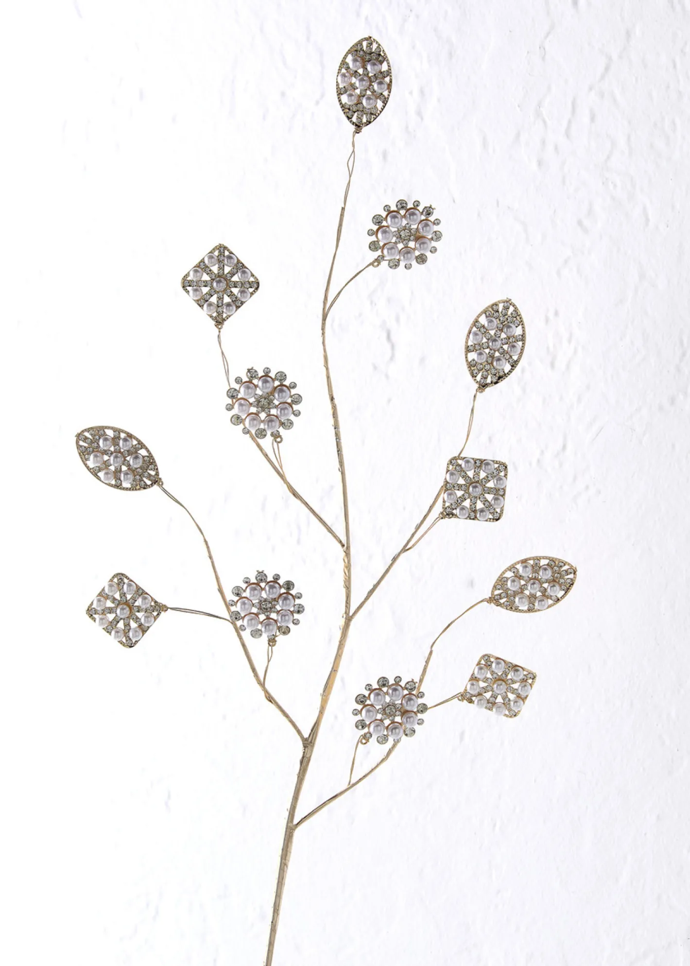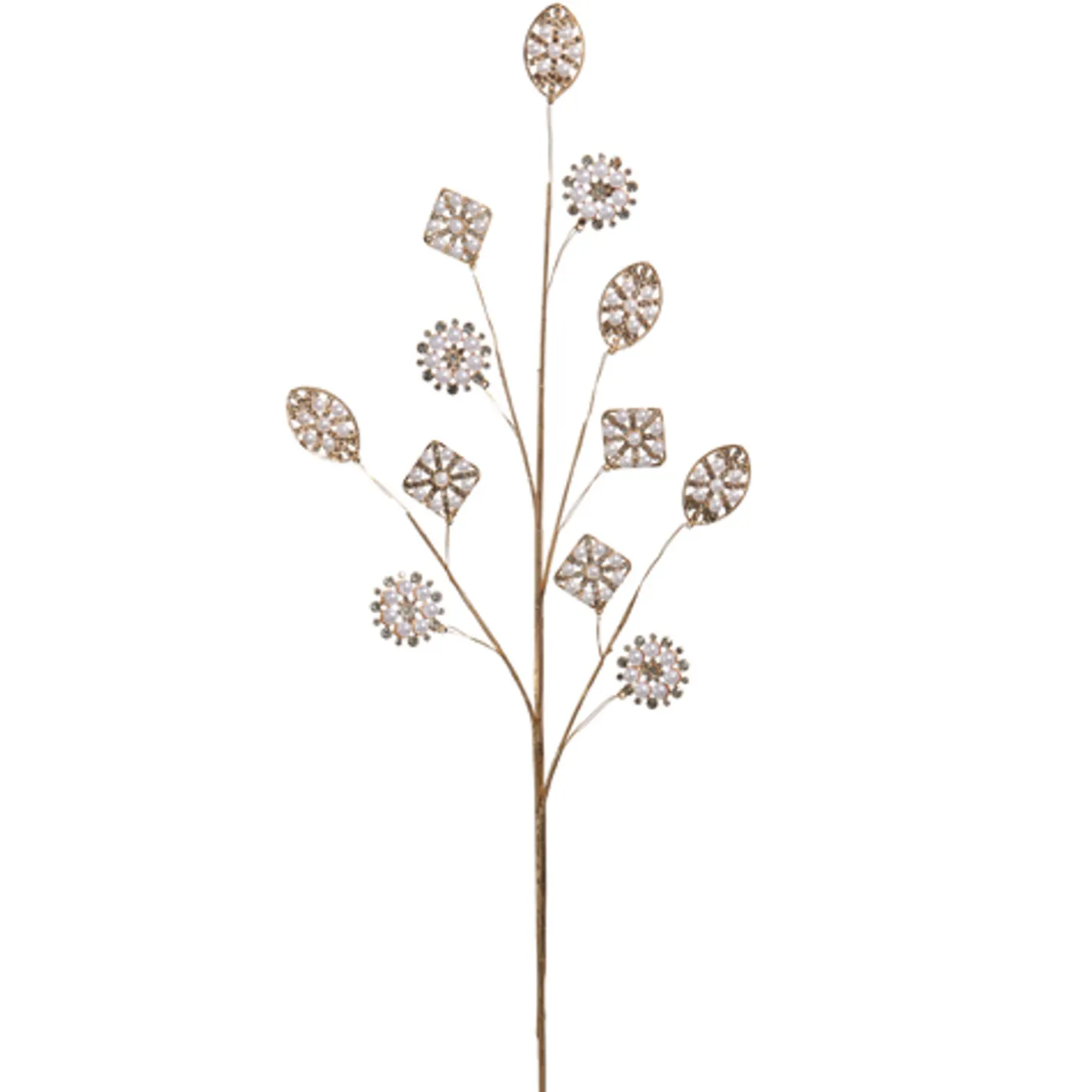 Gorgeous vintage inspired brooches are made up of shimmering pearls set in gold! This jeweled Christmas spray is perfect for an elegant vintage inspired tree, wreath, or garland! Made by Raz Imports. Made of iron and plastic. Dimensions: 29″.