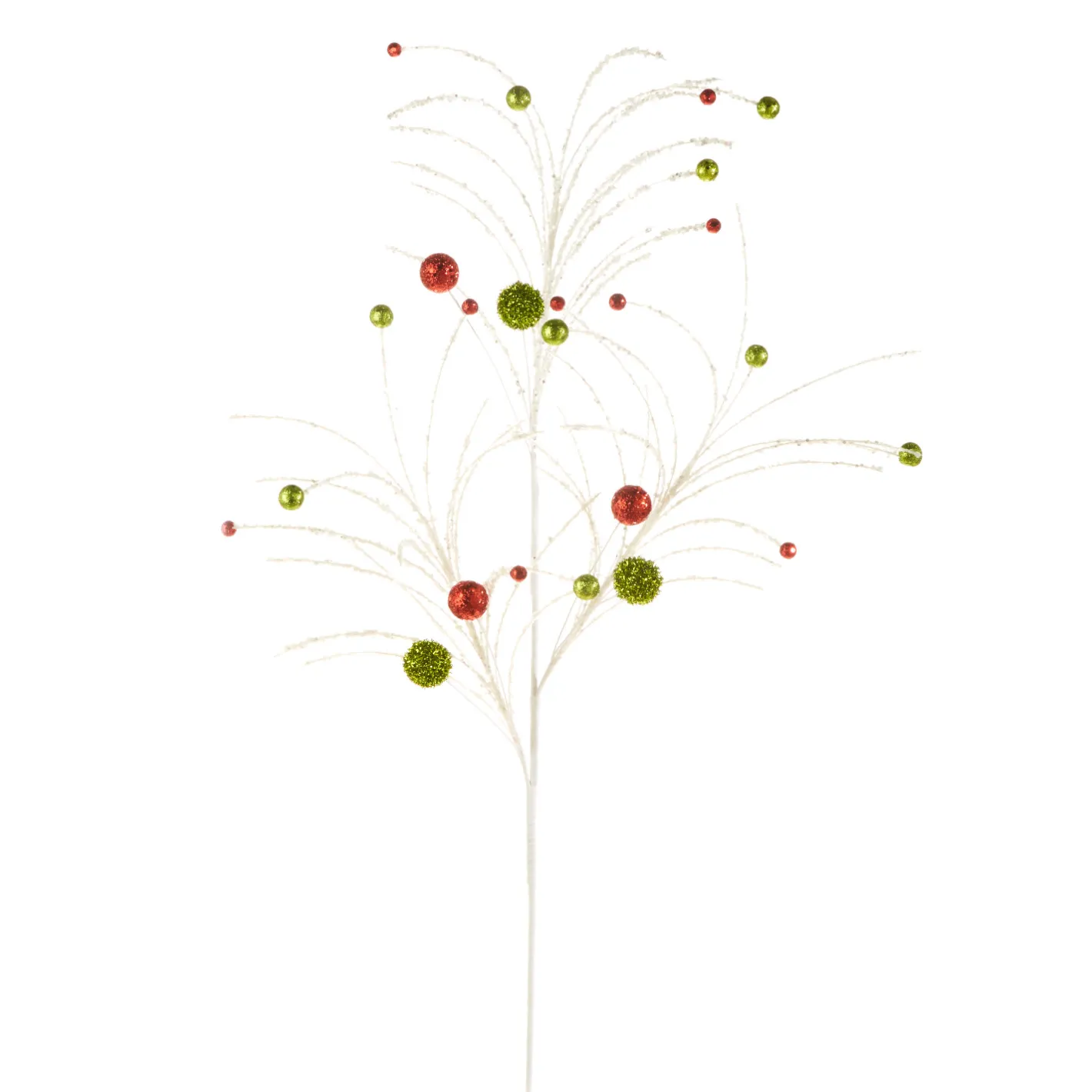 F-U-N describes this awesome Christmas spray! It features a white glitter stem with a spray tipped with glittered dark green and red balls! Perfect for adding to your Christmas tree, garlands or wreaths. Made by Raz Imports. Dimensions: 42″.