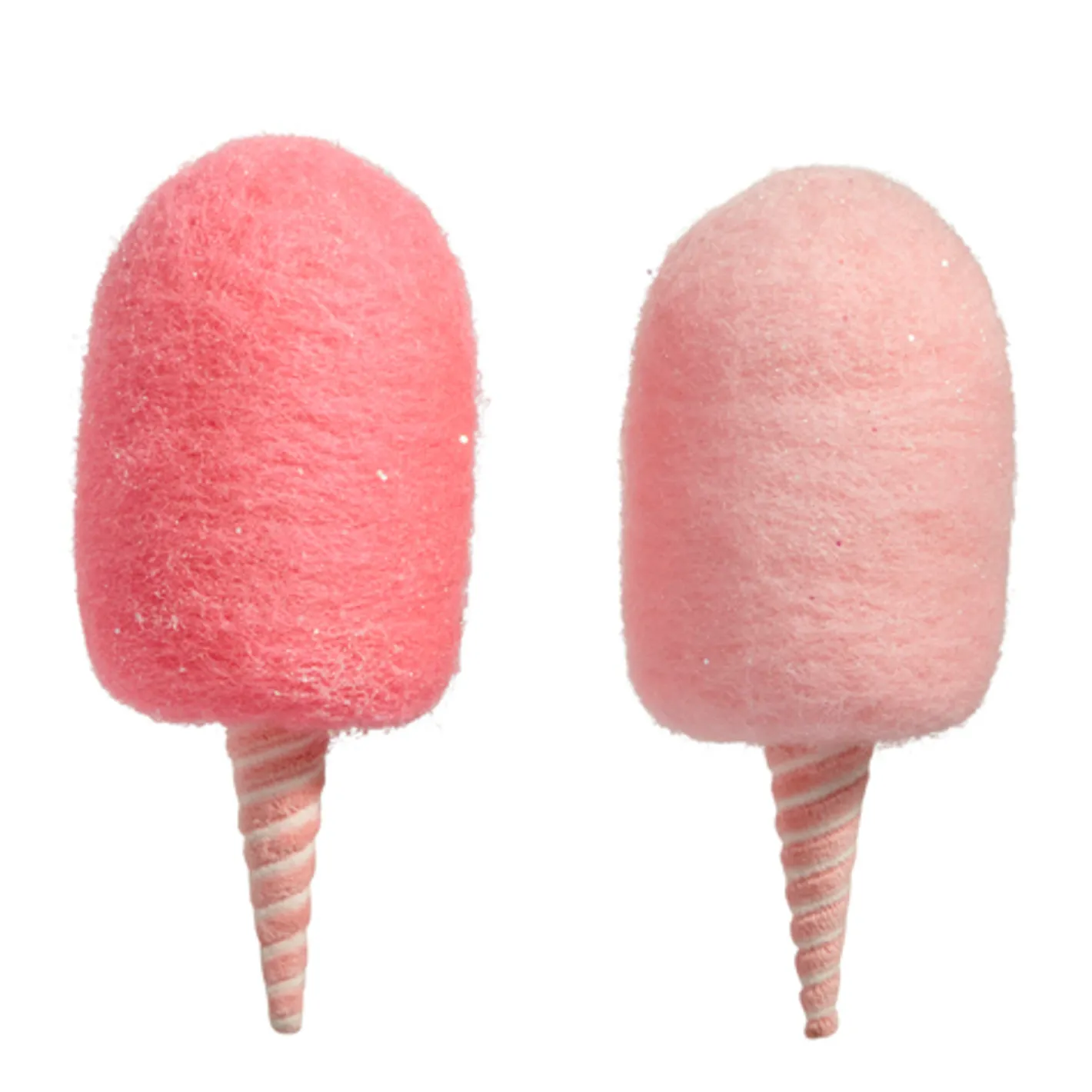 Candy Christmas decor will never go out of style and you just can’t find a sweeter ornament! This set features a pink and white cone topped with fluffy, swirled cotton candy with a fine dusting of glitter! Sold as a set of 2. Made by Raz Imports. Made of polyester and foam. Dimensions: 6.5″.