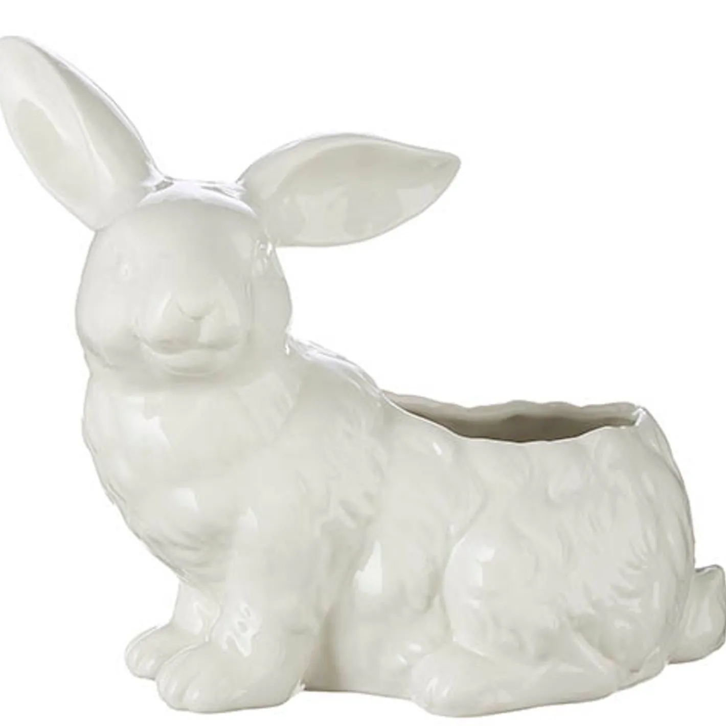 Show off your favorite Spring flowers in this cutie patootie decoration! It features a white bunny with a spot on his back to place flowers or your favorite Easter treats! Items show in container not included. Made by Raz Imports. Made of porcelain. Dimensions: 8.5″ long.