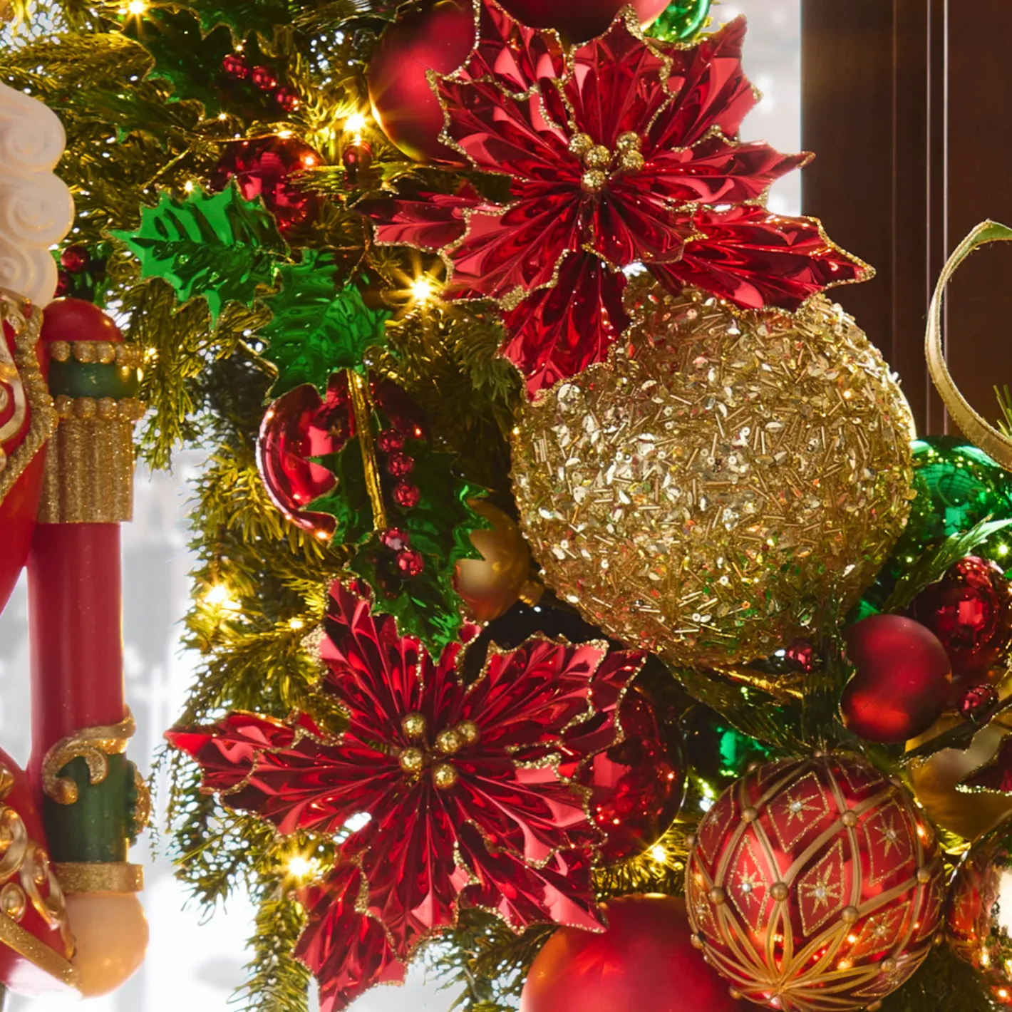 Adorn your wreath, Christmas tree or garland this holiday season with some beautiful poinsettias! This one is made of metallic red leaves trimmed in shimmering gold glitter! Perfect to easily clip on your wreath, down the length of a garland, or scattered around your tree! Made by Raz Imports. Made of plastic and iron. Dimensions: 8″ D X 3″ H.