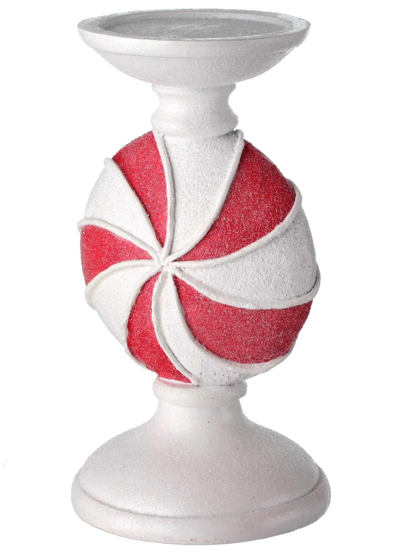 Add a touch of peppermint to your mantle display with these adorably sweet pillar candle holders! These are great to use with battery operated pillar candles or even as risers for your favorite ornament or small figure! Each sold individually. Candle sold separately. Made by Regency International. Made of resin. Dimensions: 9″ or 11.5″. Item #: MTX66252 or MTX66253